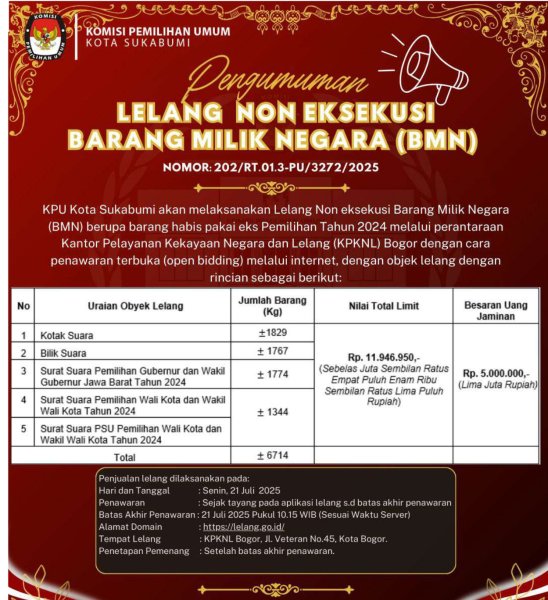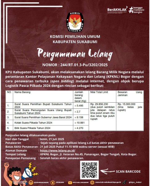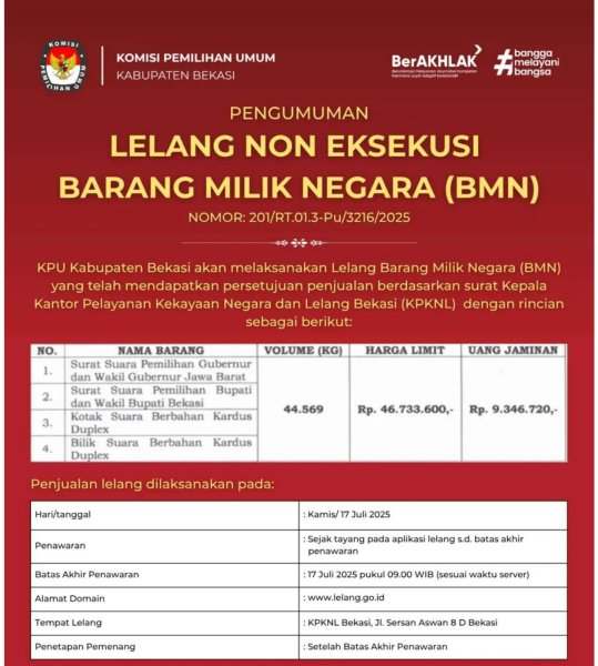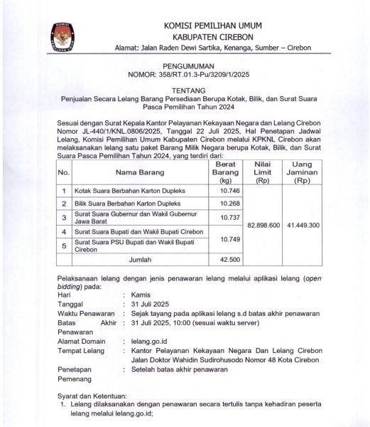 KPU Kabupaten Cirebon akan melaksanakan Lelang melalui Kantor Pelayanan Kekayaan Negara dan Lelang (KPKNL) Cirebon, dengan uraian sebagai berikut Kotak Suara Berbahan Karton Dupleks, Bilik Suara Berbahan Karton Dupleks, Surat Suara Gubernur dan Wakil Gubernur Jawa Barat, Surat Suara Bupati dan Wakil Bupati Cirebon dan Surat Suara PSU Bupati dan Wakil Bupati Cirebon. Informasi terkait objek lelang dapat menghubungi kantor KPU Kabupaten Cirebon yang beralamat di Jl. Raden Dewi Sartika Kelurahan Kenanga Kecamatan Sumber Kabupaten Cirebon.