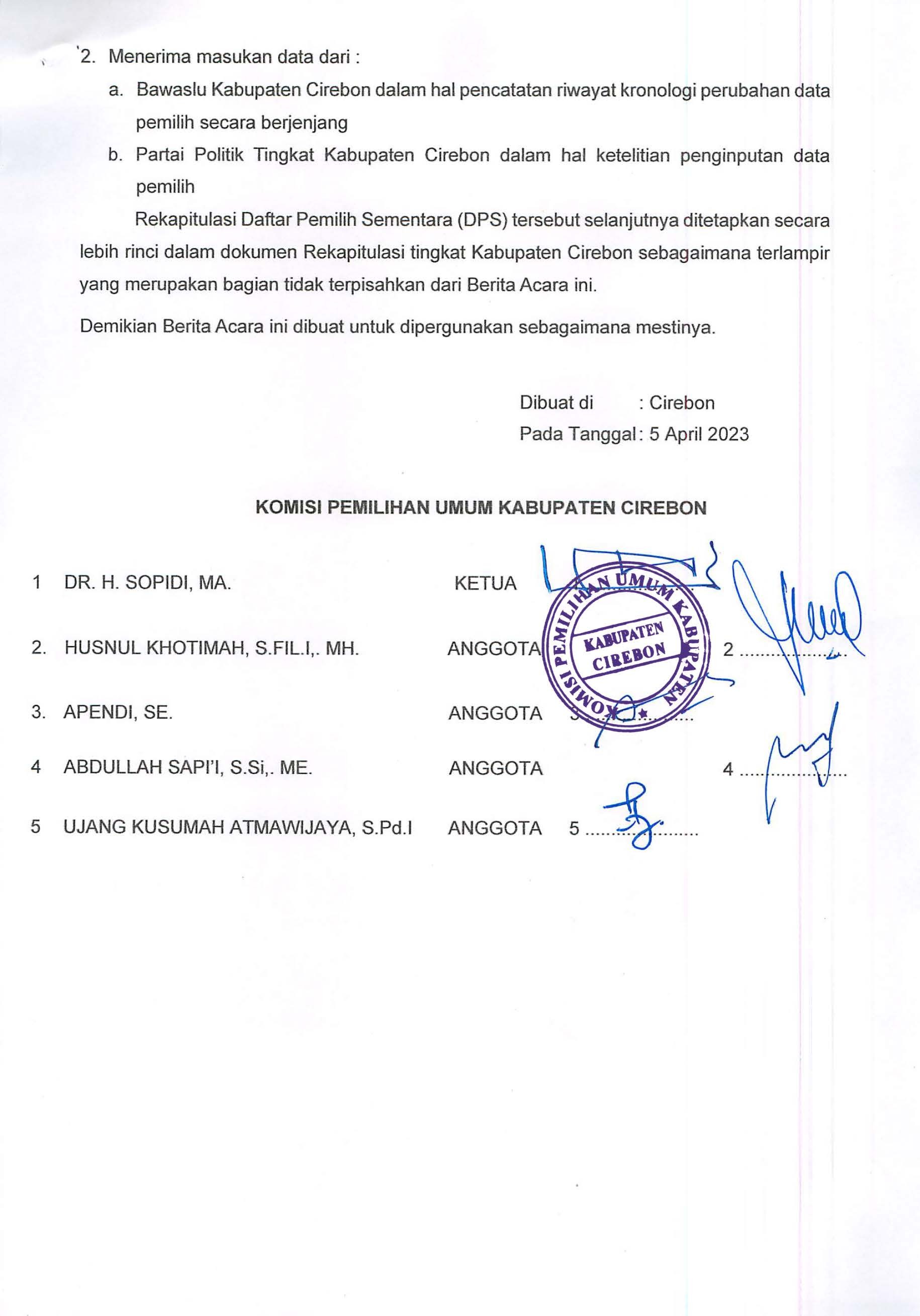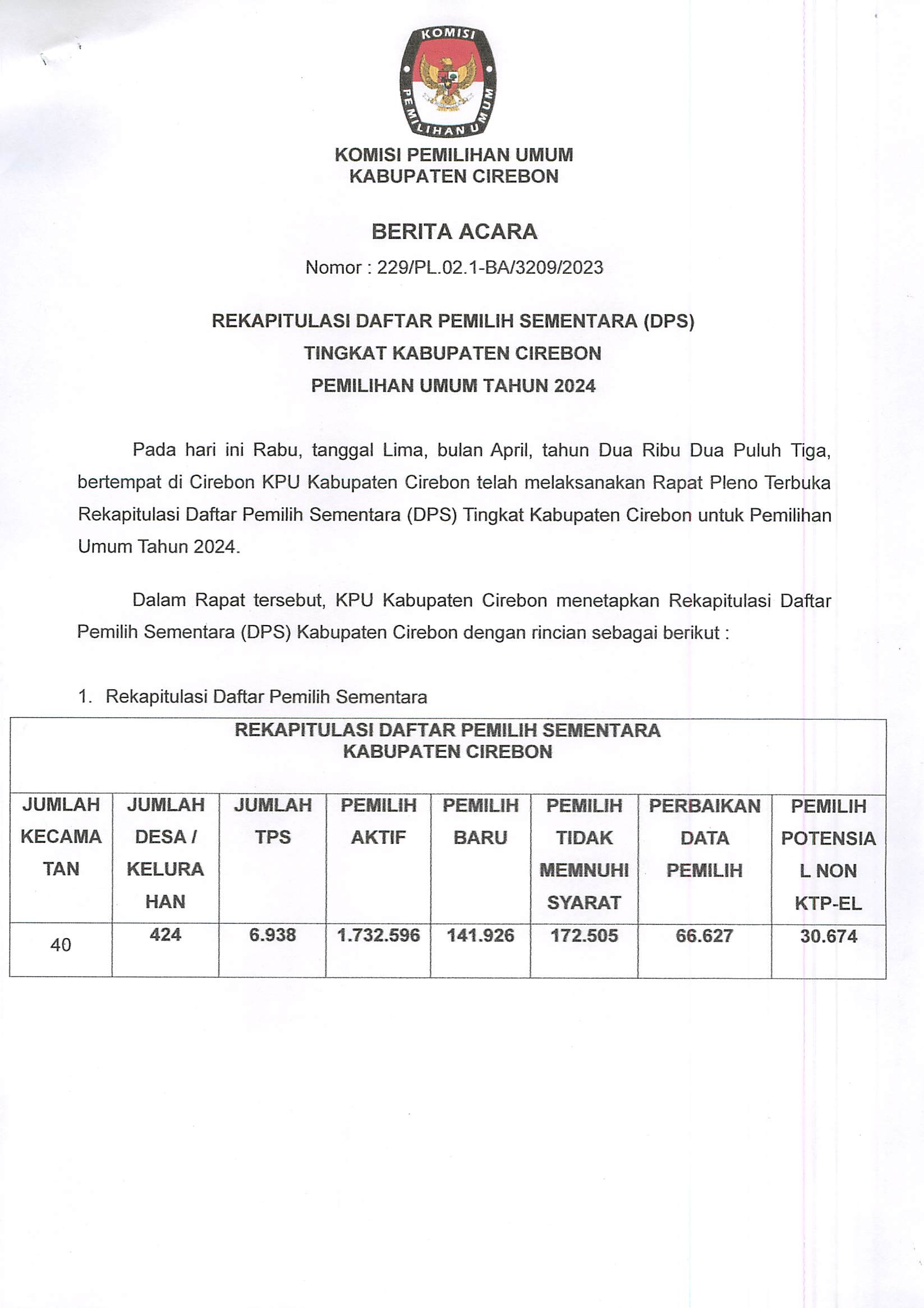 BA NOMOR 229 TAHUN 2023 (REKAPITULASI DPS TINGKAT KABUPATEN CIREBON PEMILU 2024) Kamis, 06 April 2023 08:21 326 file bisa di unduh disini Bagikan: Telah dilihat 326 kali