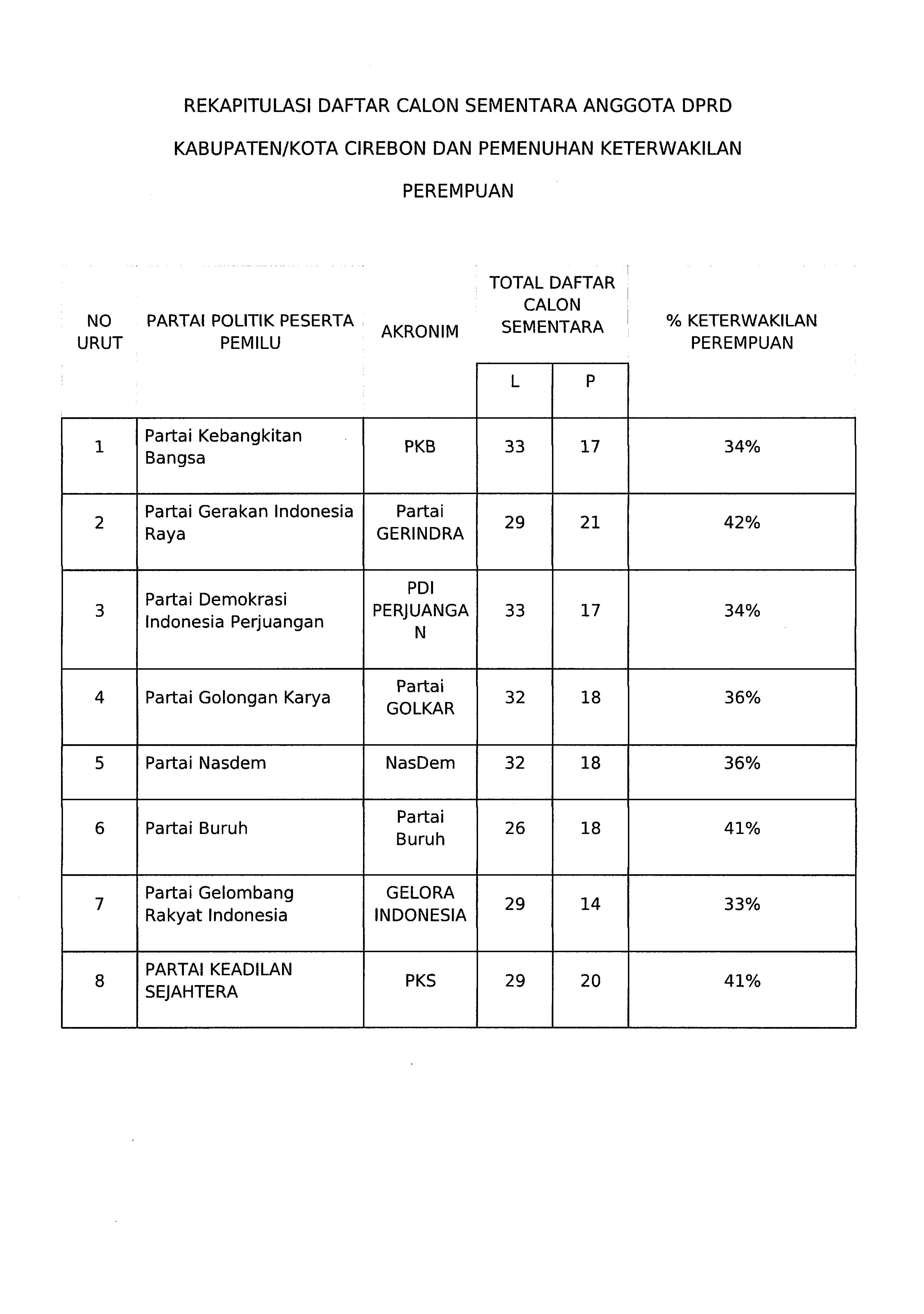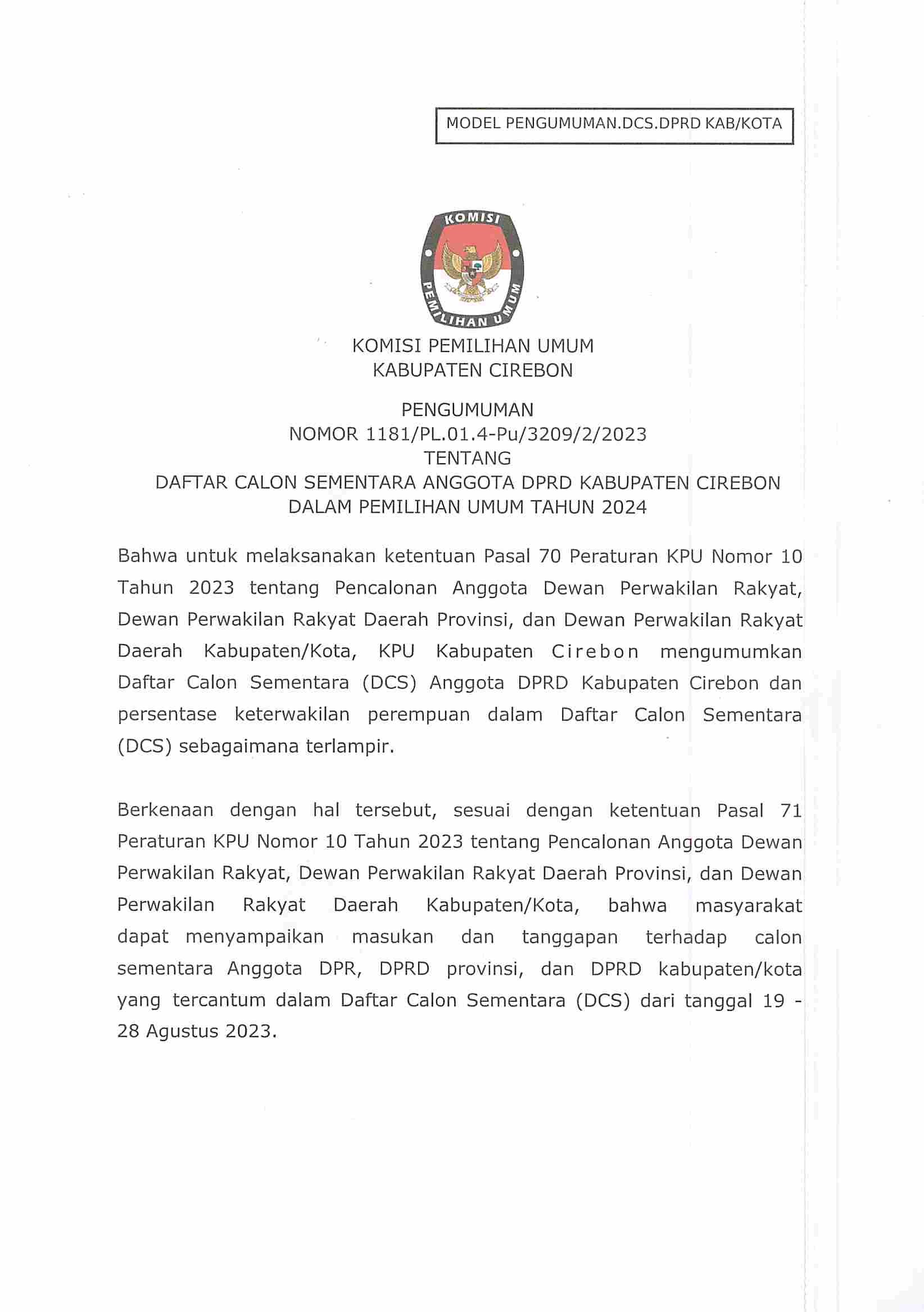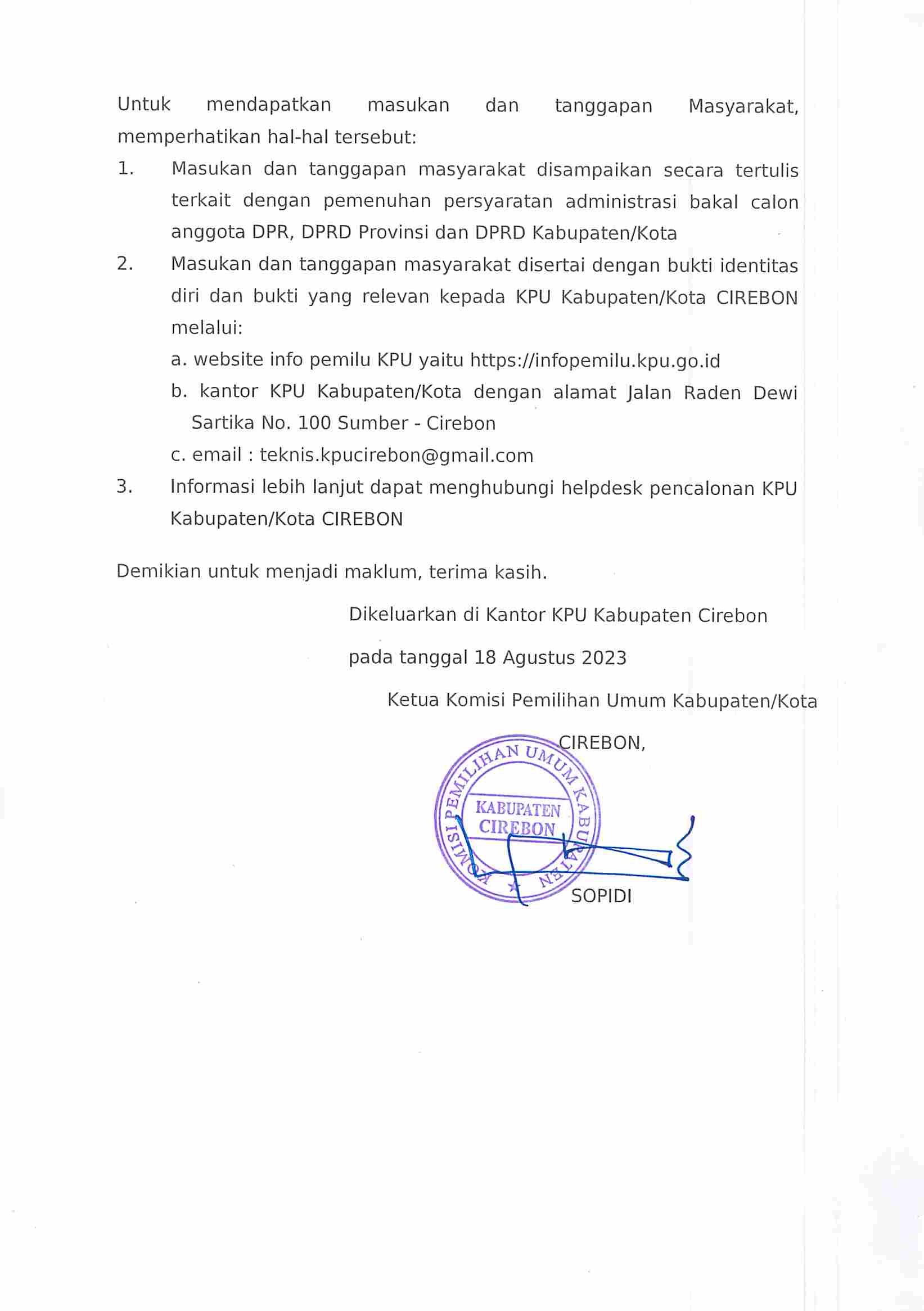 DAFTAR CALON SEMENTARA ANGGOTA DPRD KABUPATEN CIREBON DALAM PEMILIHAN UMUM TAHUN 2024 Sabtu, 19 Agustus 2023 00:01 5350 Lampiran Pengumuman bisa di unduh disini Bagikan: Telah dilihat 5,350 kali