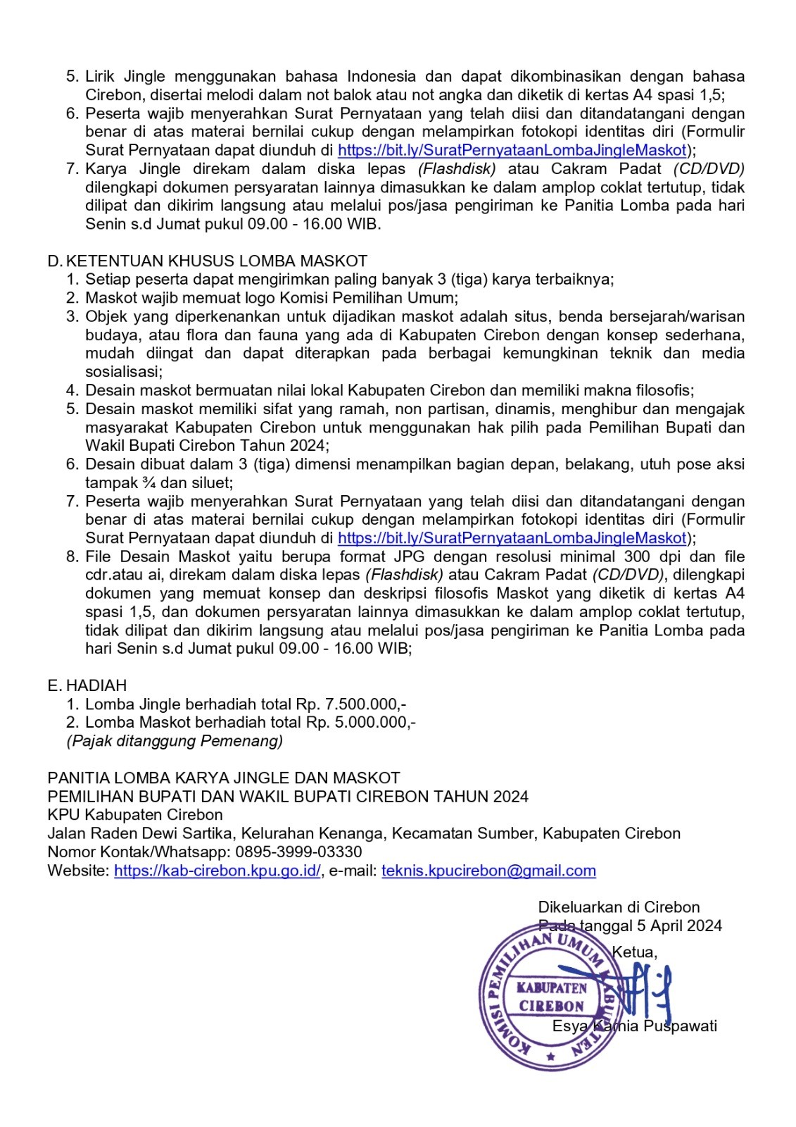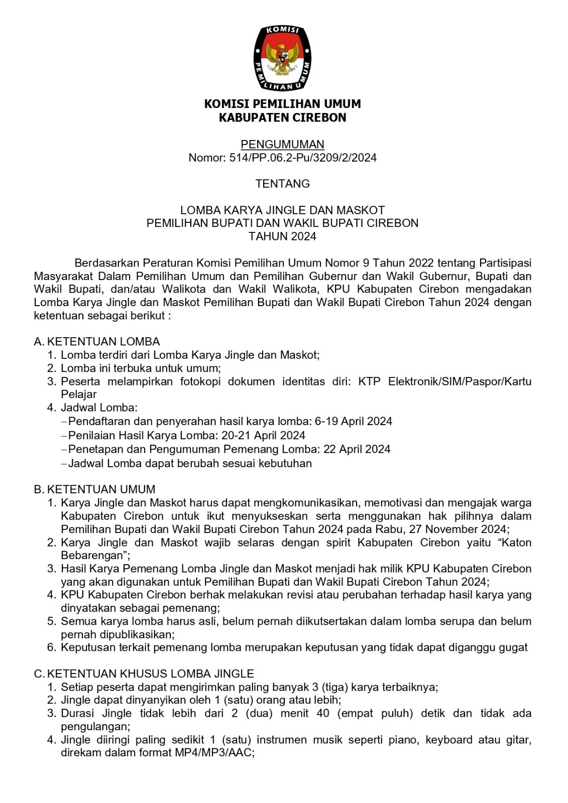 LOMBA KARYA JINGLE DAN MASKOT PEMILIHAN BUPATI DAN WAKIL BUPATI CIREBON TAHUN 2024