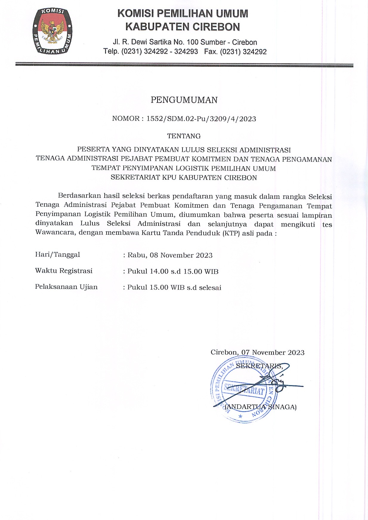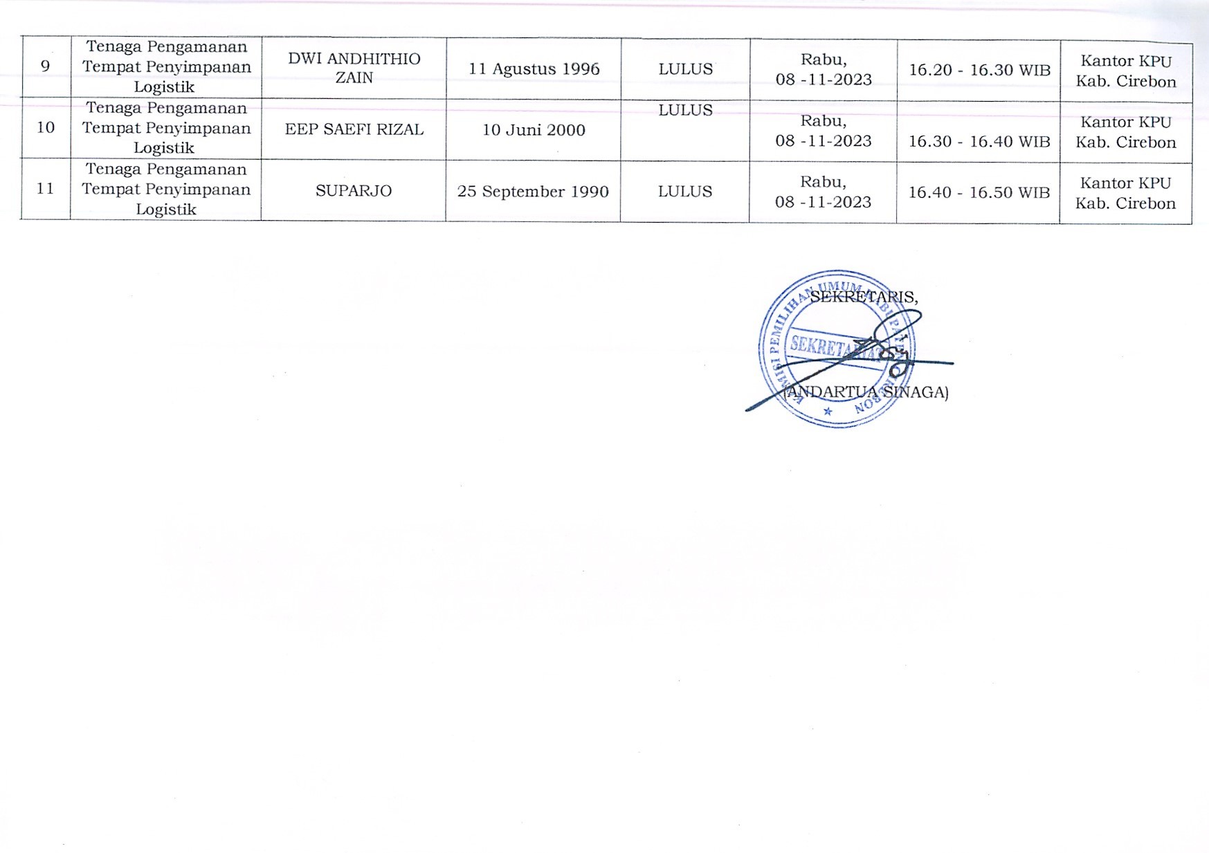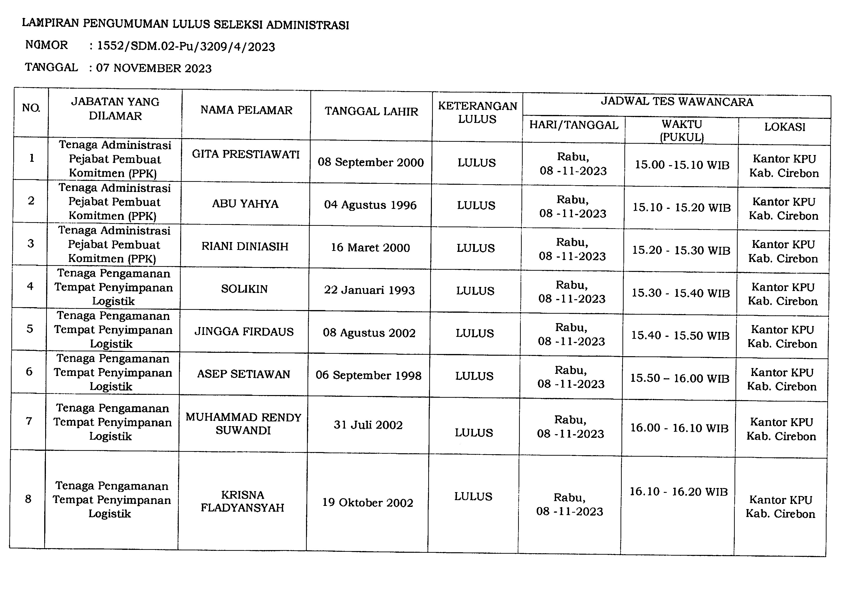 PEENGUMUMAN PESERTA YANG DINYATAKAN LULUS SELEKSI ADMINISTRASI TENAGA ADMINISTRASI PEJABAT PEMBUAT KOMITMEN DAN TENAGA PENGAMANAN TEMPAT PENYIMPANAN LOGISTIK