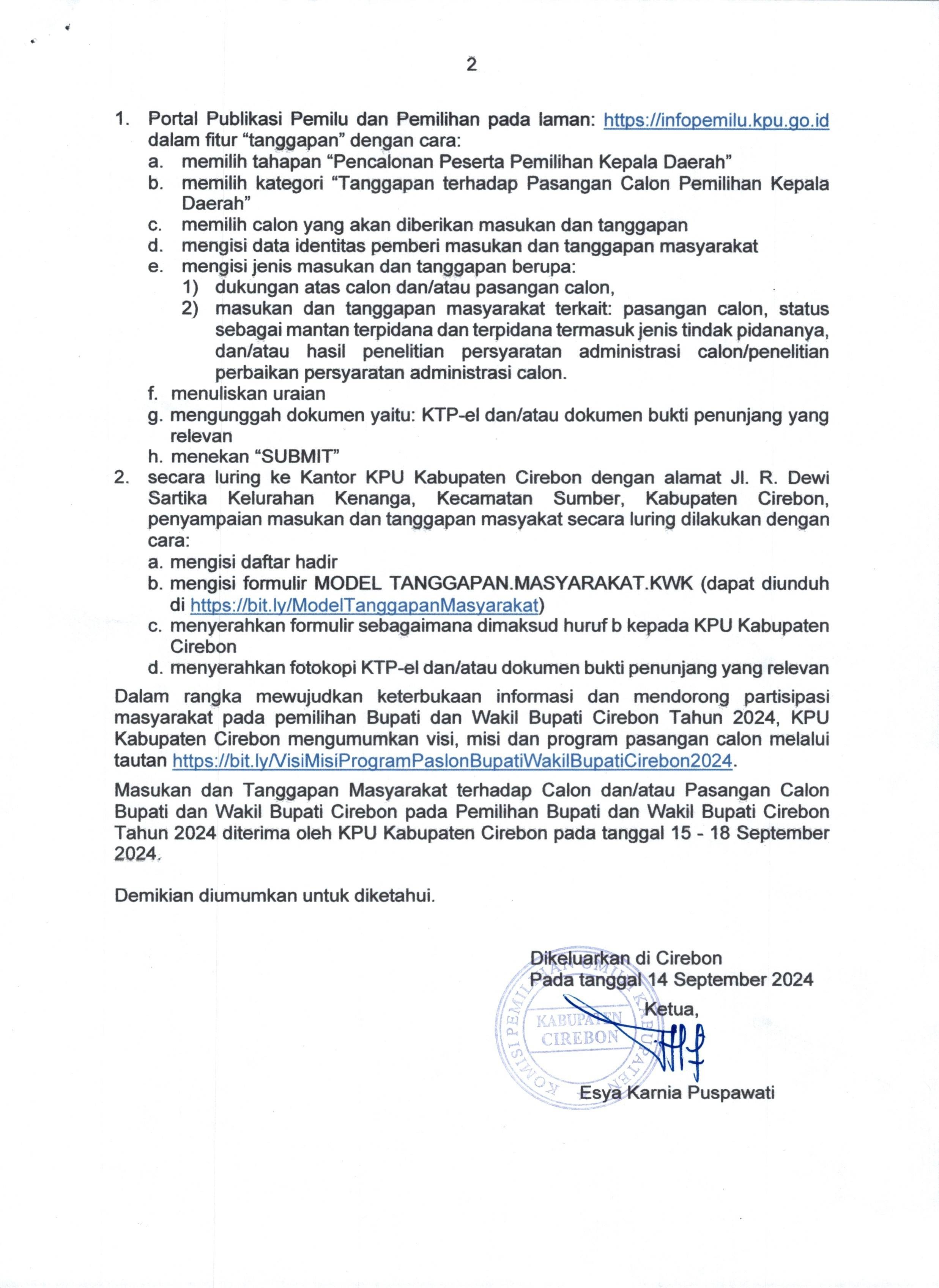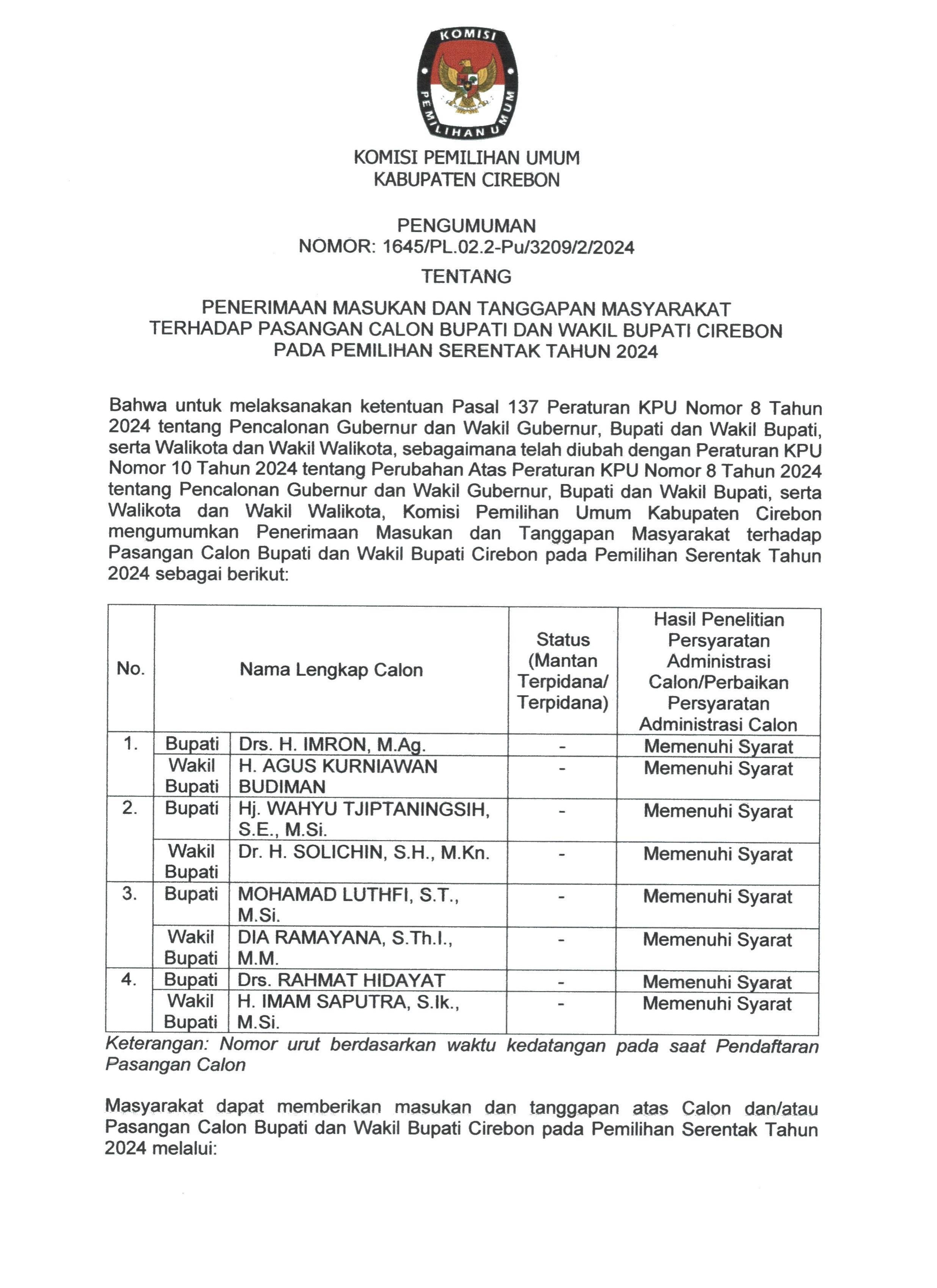 PENERIMAAN MASUKAN DAN TANGGAPAN MASYARAKAT TERHADAP PASANGAN CALON BUPATI DAN WAKIL BUPATI CIREBON PADA PEMILIHAN SERENTAK TAHUN 2024