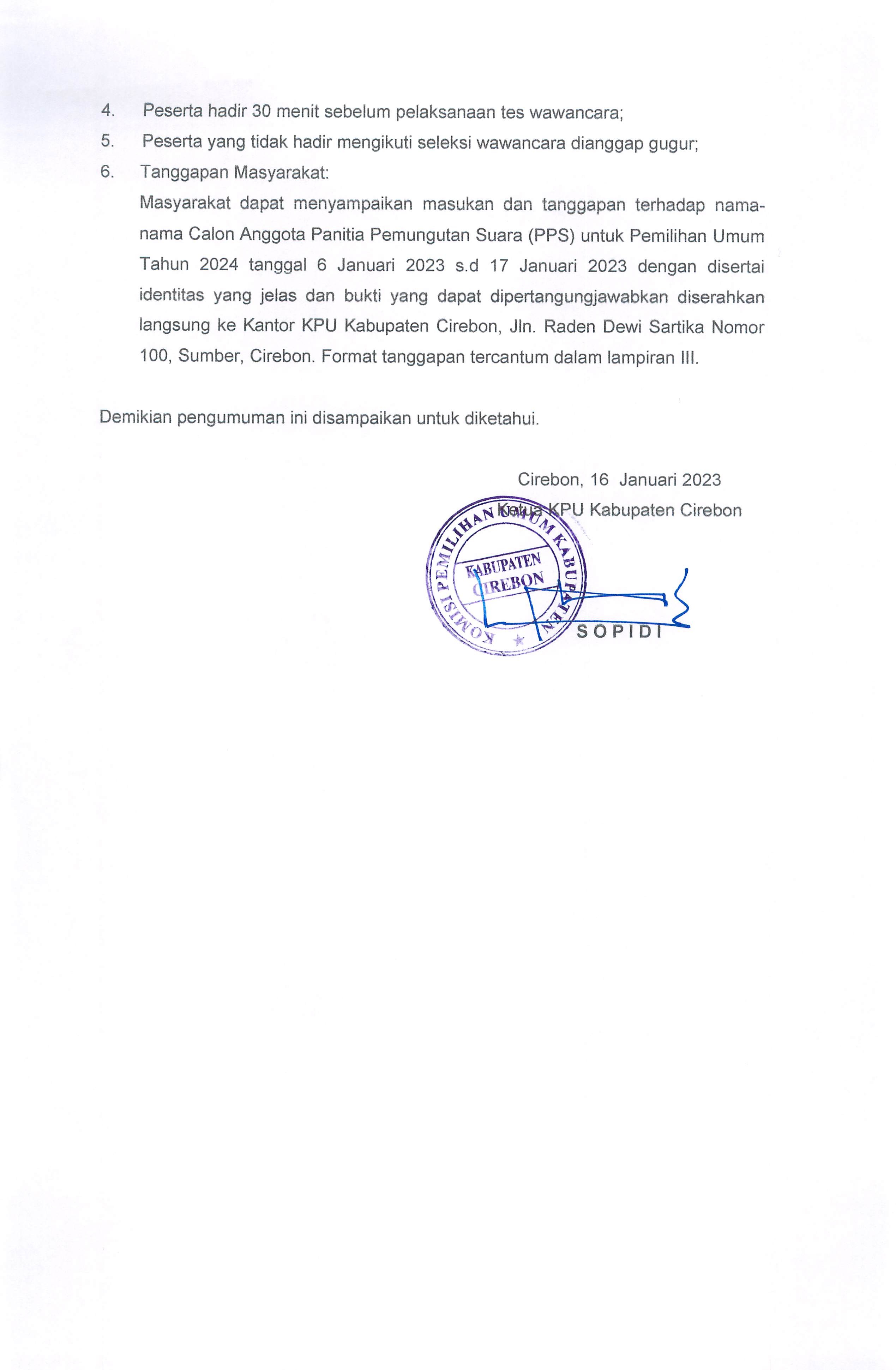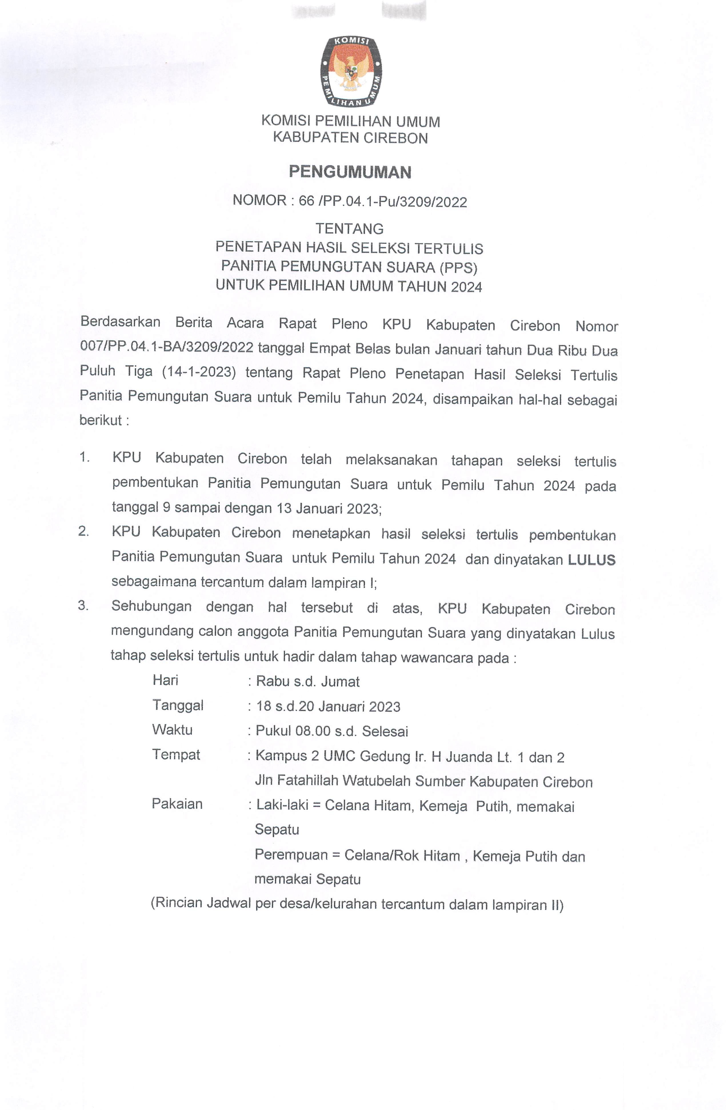 PENETAPAN HASIL SELEKSI TERTULIS PANITIA PEMUNGUTAN SUARA (PPS) UNTUK PEMILIHAN UMUM TAHUN 2024 Senin, 16 Januari 2023 01:10 610 Link Download disini Bagikan: Telah dilihat 610 kali