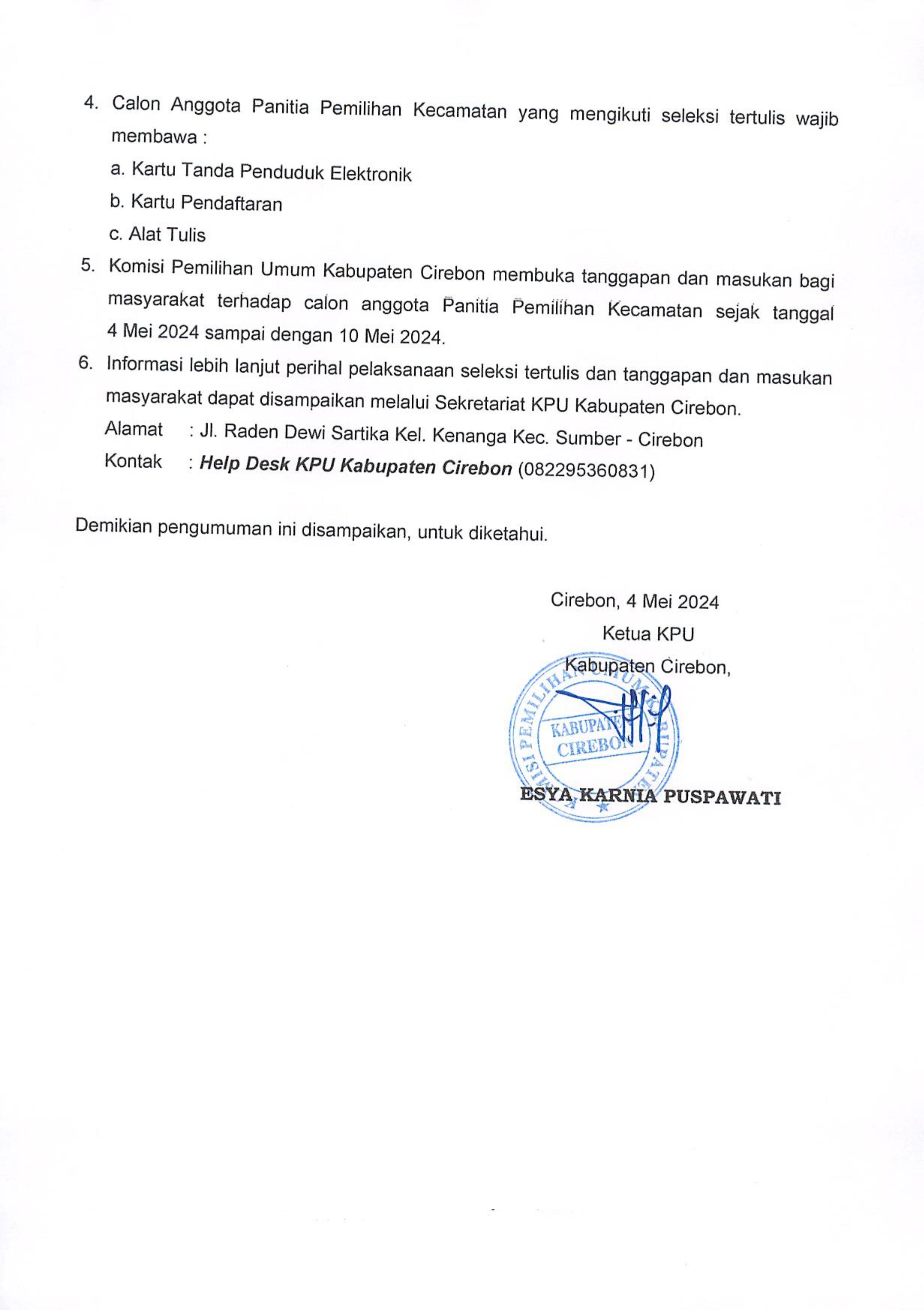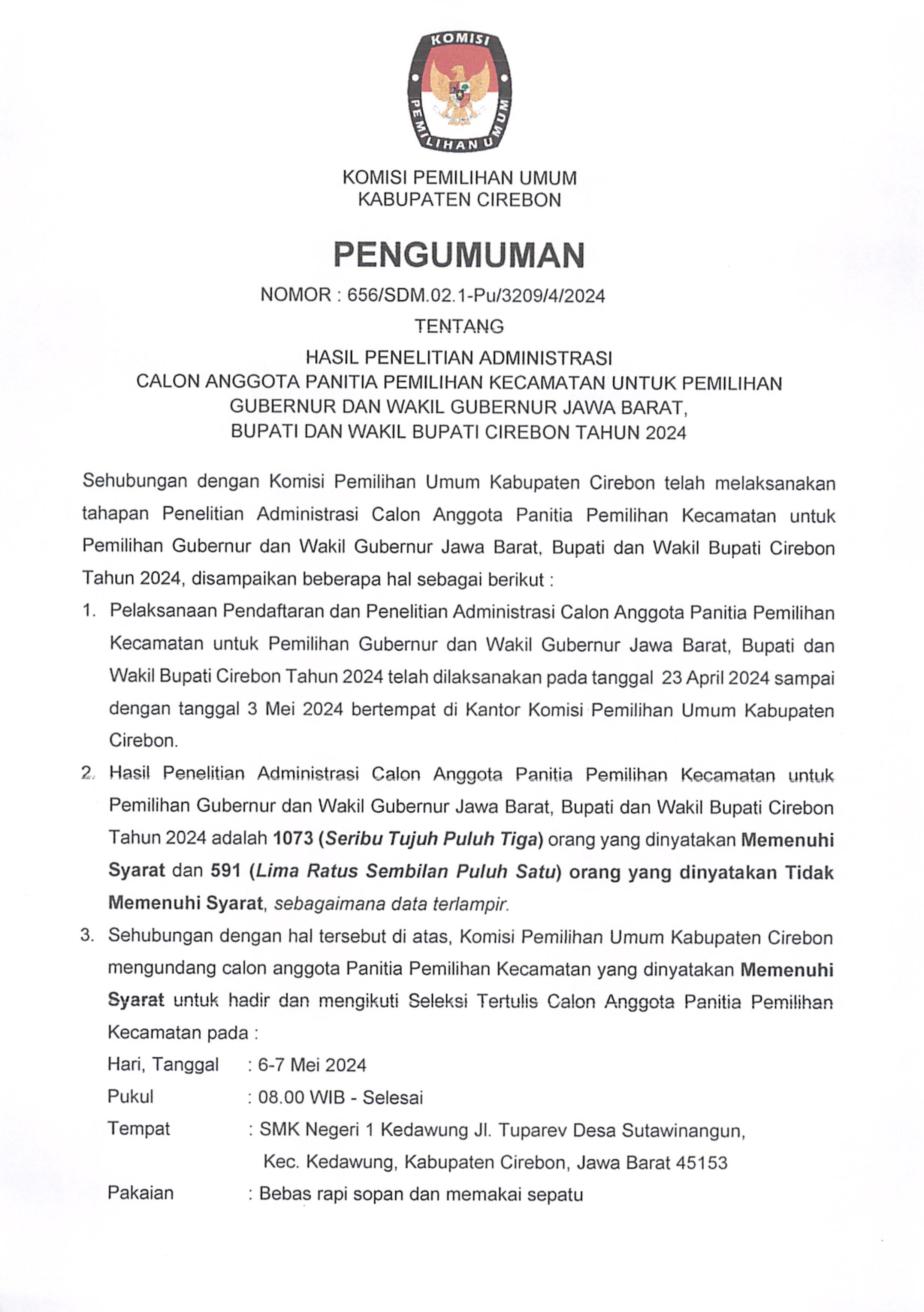 PENGUMUMAN HASIL PENELITIAN ADMINISTRASI CALON ANGGOTA PPK PILKADA TAHUN 2024