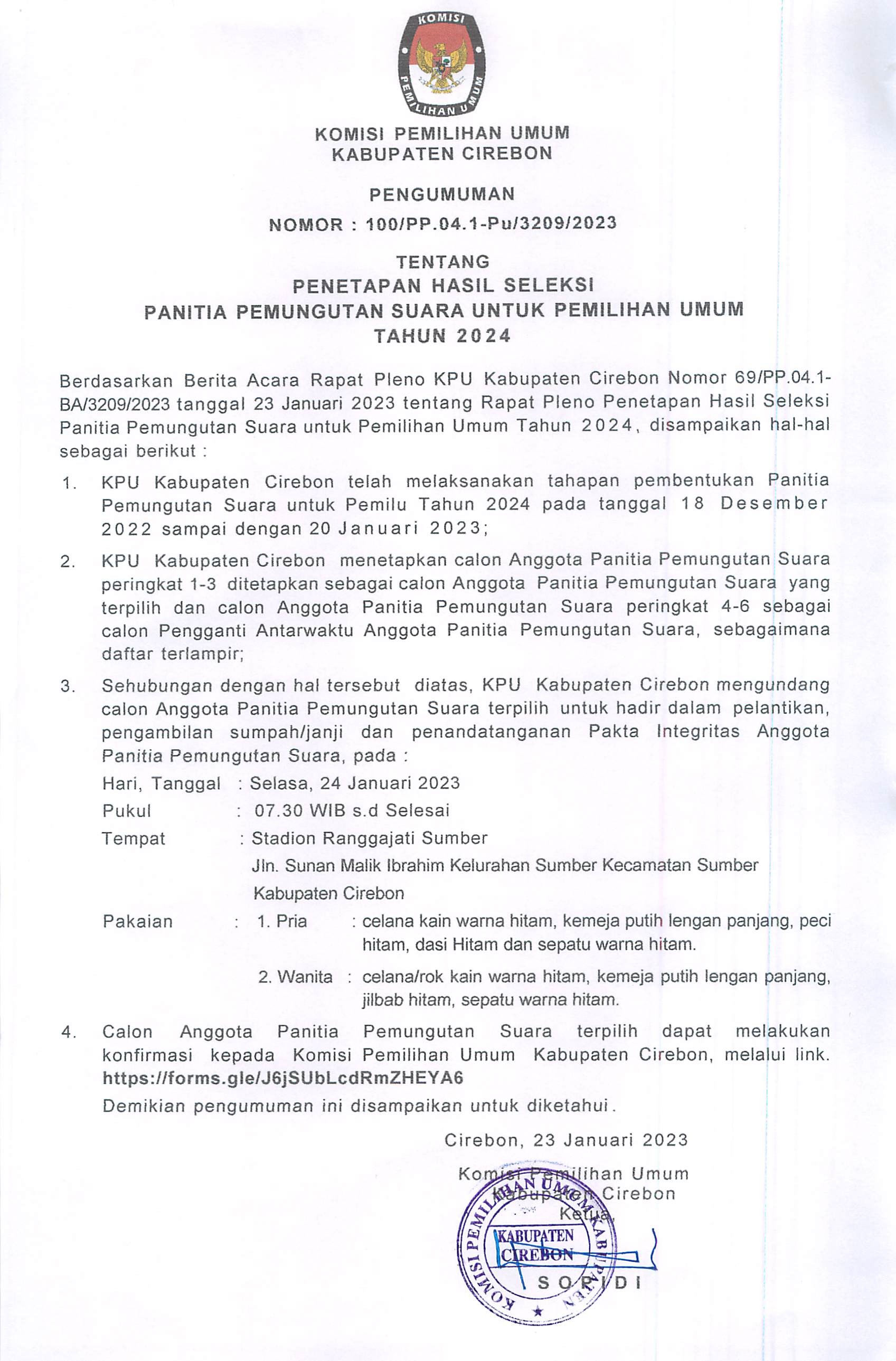 PENGUMUMAN PENETAPAN HASIL SELEKSI PANITIA PEMUNGUTAN SUARA UNTUK PEMILIHAN UMUM TAHUN 2024 Senin, 23 Januari 2023 08:21 568 untuk lampiran bisa download disini Bagikan: Telah dilihat 568 kali
