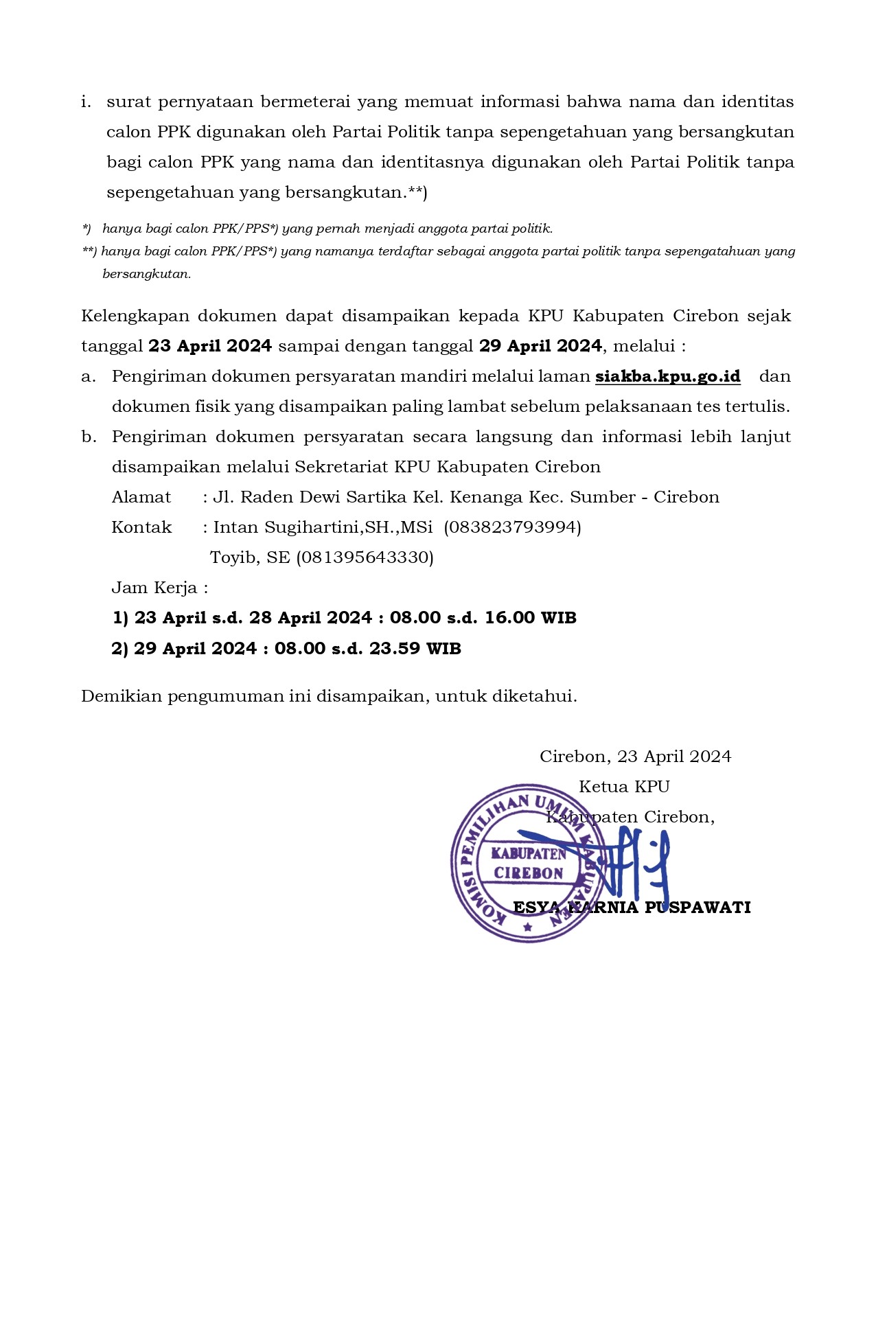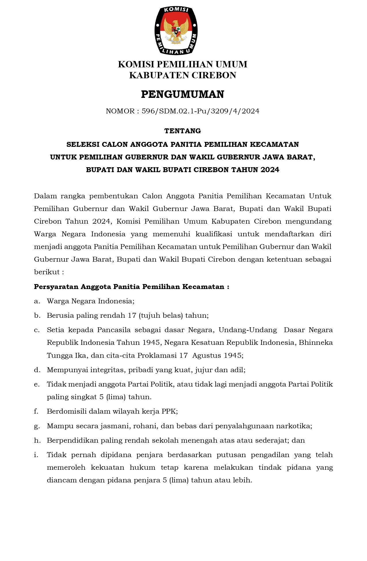Pengumuman Seleksi Calon Anggota Panitia Pemilihan Kecamatan Untuk Pemilihan Gubernur dan Wakil Gubernur Jawa Barat, Bupati dan Wakil Bupati Cirebon Tahun 2024