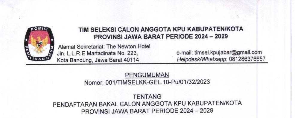 Berdasarkan Keputusan KPU Nomor 1397 Tahun 2023 tentang Jadwal Tahapan Pelaksanaan Seleksi Calon Anggota Komisi Pemilihan Umum Provinsi pada 5 (Lima) Provinsi dan Komisi Pemilihan Umum Kabupaten/Kota pada 43 (Empat Puluh Tiga) Kabupaten/Kota di 9 (sembilan) Provinsi Periode 2024 - 2029,