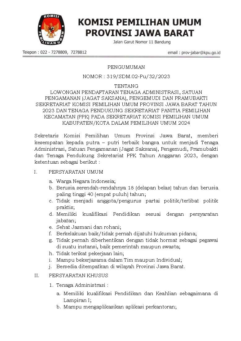 LOWONGAN PENDAFTARAN TENAGA ADMINISTRASI, SATUAN PENGAMANAN (JAGAT SAKSANA), PENGEMUDI DAN PRAMUBAKTI SEKRETARIAT KOMISI PEMILIHAN UMUM PROVINSI JAWA BARAT TAHUN 2023 DAN TENAGA PENDUKUNG SEKRETARIAT PANITIA PEMILIHAN KECAMATAN (PPK) PADA SEKRETARIAT KOMISI PEMILIHAN UMUM KABUPATEN/KOTA DALAM PEMILIHAN UMUM 2024