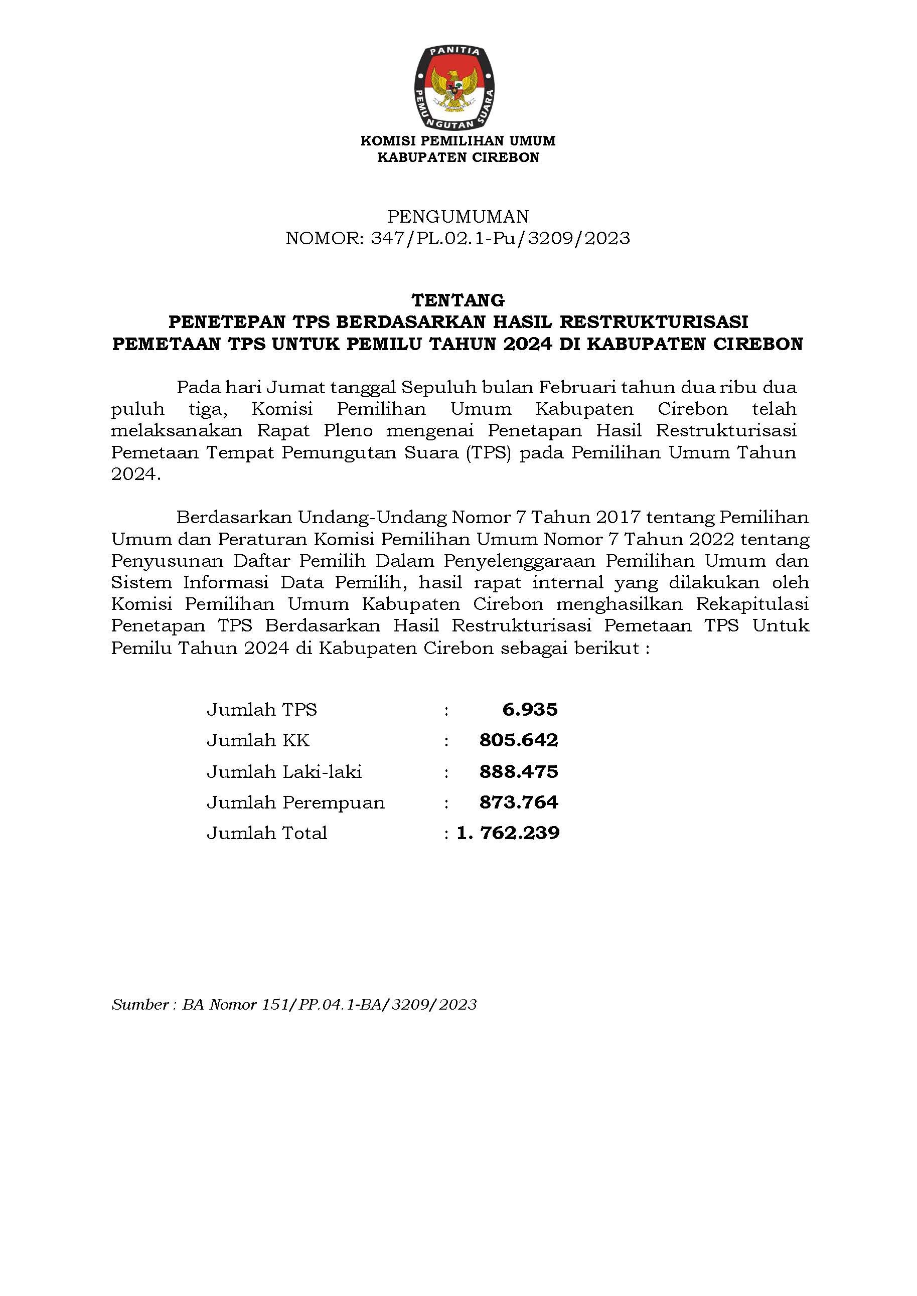 Persyaratan Pantarlih : Warga negara Indonesia; berusia paling rendah 17 (tujuh belas) tahun; tidak menjadi anggota Partai Politik yang dinyatakan dengan surat pernyataan yang sah, atau paling singkat 5 (lima) tahun tidak lagi menjadi anggota partai politik yang dibuktikan dengan surat keterangan dari pengurus partai politik yang bersangkutan; berdomisili dalam wilayah kerja; mampu secara jasmani dan rohani; berpendidikan paling rendah sekolah menengah atas atau sederajat; Kelengkapan Dokumen Persyaratan : Surat pendaftaran sebagai calon Pantarlih, yang formatnya menggunakan format yang sebagaimana tercantum dalam Lampiran …; Fotokopi Kartu Tanda Penduduk untuk persyaratan huruf a dan huruf b; Fotokopi ijazah sekolah menengah atas/sederajat atau ijazah terakhir yang dilegalisasi oleh pejabat yang berwenang atau Surat keterangan dari lembaga pendidikan formal yang menyatakan bahwa yang bersangkutan sedang menjalani pendidikan sekolah menengah atas/sederajat untuk persyaratan huruf f; Surat pernyataan untuk persyaratan huruf c merupakan satu dokumen Surat Pernyataan sebagaimana tercantum dalam Lampiran …; Surat keterangan sehat jasmani dan rohani untuk persyaratan huruf e yang dikeluarkan oleh puskesmas, rumah sakit, atau klinik yang termasuk di dalamnya terdapat pemeriksaan tekanan darah, kadar gula darah, dan kolesterol; Daftar Riwayat Hidup sebagaimana tercantum dalam Lampiran ….; Pas Foto Berwarna 3x4. JADWAL PEMBENTUKAN PETUGAS PEMUKTAHIRAN DATA PEMILIH NO TAHAP PEMBENTUKAN AWAL AKHIR 1. Pengumuman pendaftaran calon Pantarlih; 26 Januari 2023 28 Januari 2023 2. Penerimaan pendaftaran calon Pantarlih; 26 Januari 2023 31 Januari 2023 3. Penelitian administrasi calon Pantarlih; 27 Januari 2023 2 Februari 2023 4. Pengumuman hasil seleksi calon Pantarlih; 3 Februari 2023 5 Februari 2023 5. Penetapan nama hasil seleksi Pantarlih; 5 Februari 2023 5 Februari 2023 6. Pelantikan Pantarlih 6 Februari 2023 6 Februari 2023