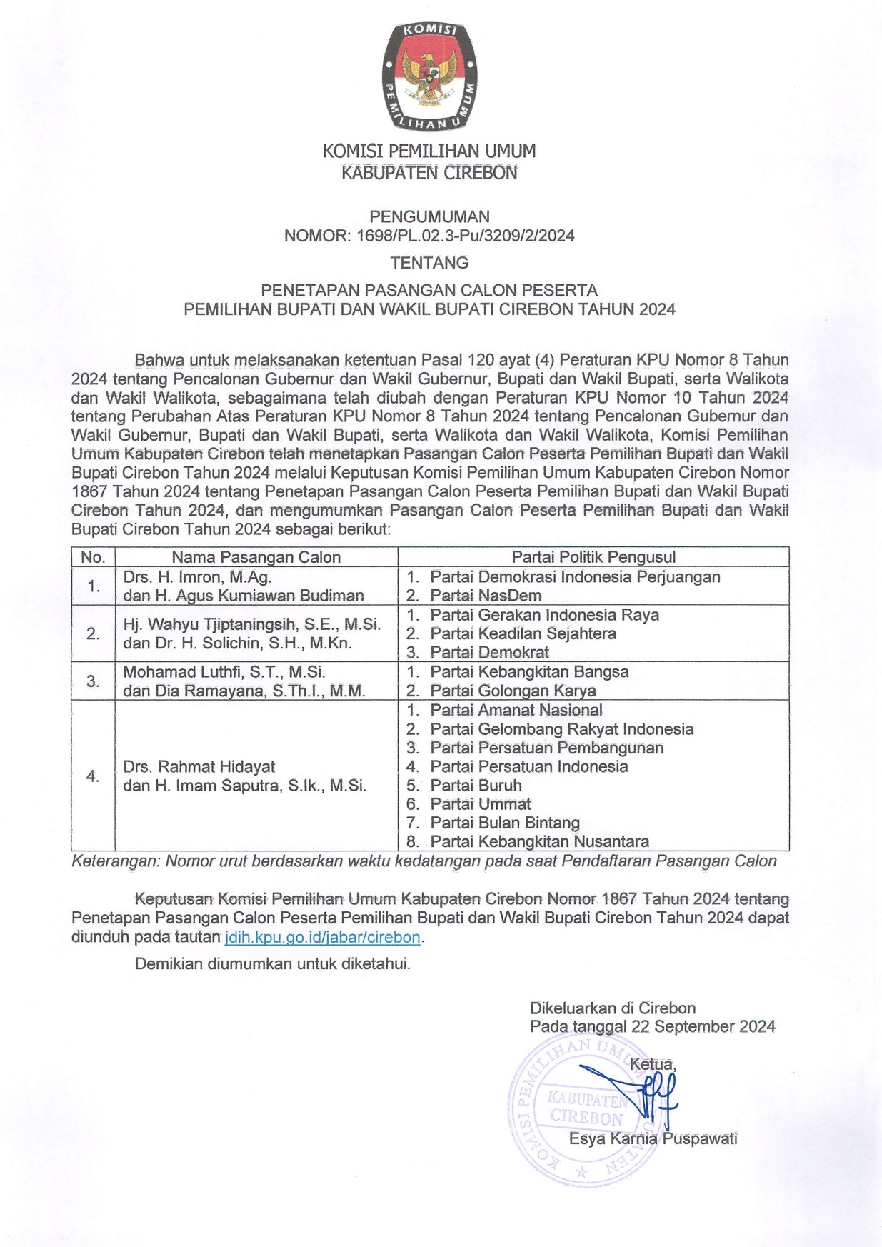 Bahwa untuk melaksanakan ketentuan Pasal 120 ayat (4) Peraturan KPU Nomor 8 Tahun 2024 tentang Pencalonan Gubernur dan Wakil Gubernur, Bupati dan Wakil Bupati, serta Walikota dan Wakil Walikota, sebagaimana telah diubah dengan Peraturan KPU Nomor 10 Tahun 2024 tentang Perubahan Atas Peraturan KPU Nomor 8 Tahun 2024 tentang Pencalonan Gubernur dan Wakil Gubernur, Bupati dan Wakil Bupati, serta Walikota dan Wakil Walikota, Komisi Pemilihan Umum Kabupaten Cirebon telah menetapkan Pasangan Calon Peserta Pemilihan Bupati dan Wakil Bupati Cirebon Tahun 2024 melalui Keputusan Komisi Pemilihan Umum Kabupaten Cirebon Nomor 1867 Tahun 2024 tentang Penetapan Pasangan Calon Peserta Pemilihan Bupati dan Wakil Bupati Cirebon Tahun 2024, dan mengumumkan Pasangan Calon Peserta Pemilihan Bupati dan Wakil Bupati Cirebon Tahun 2024 sebagai berikut: