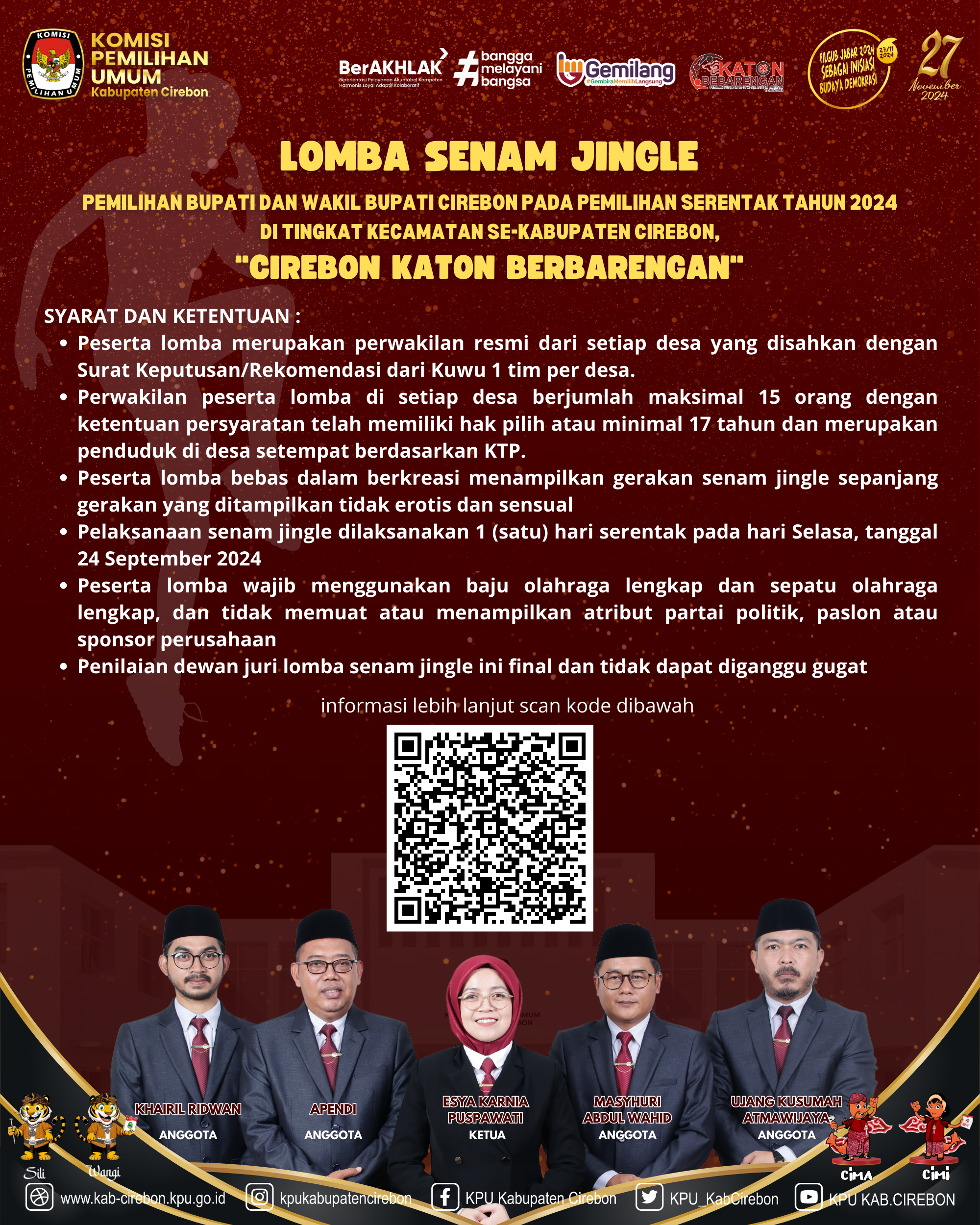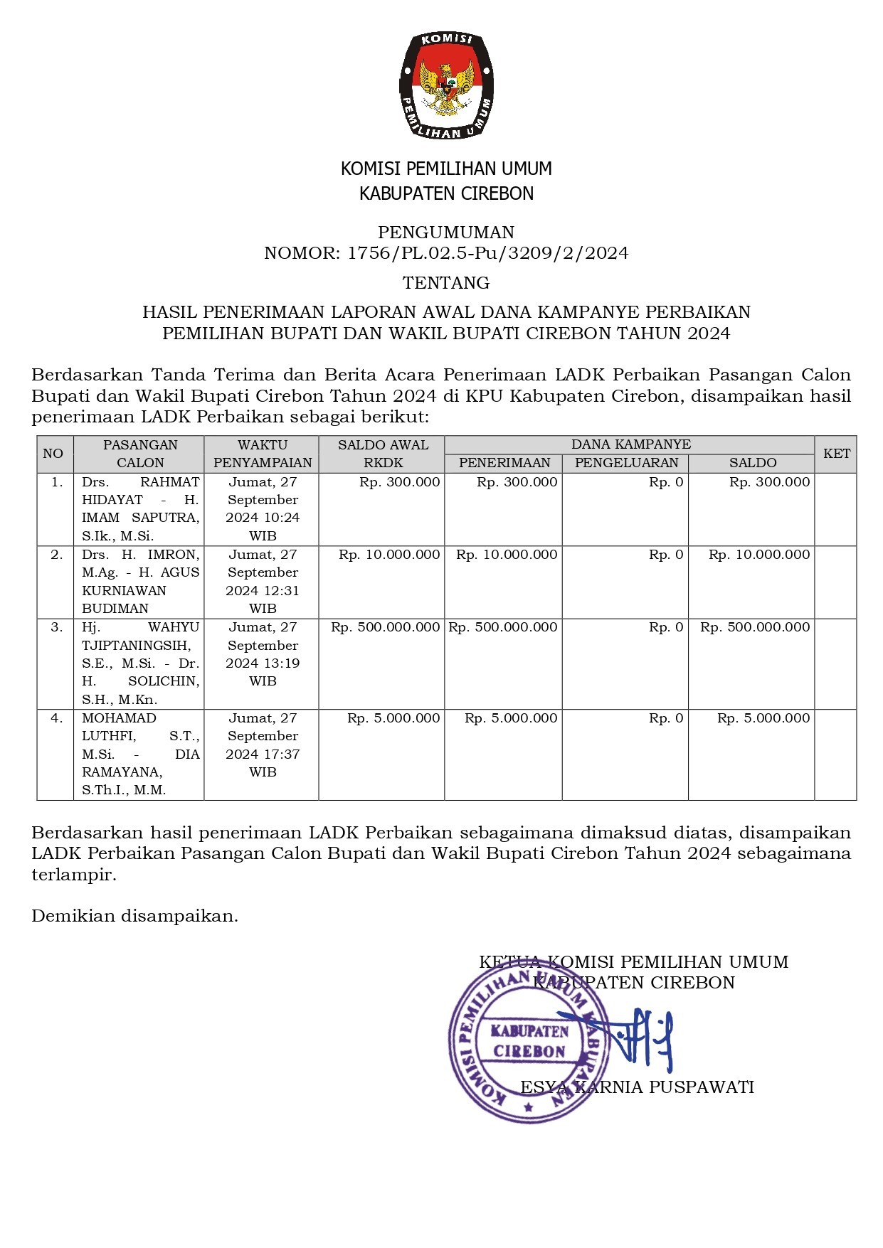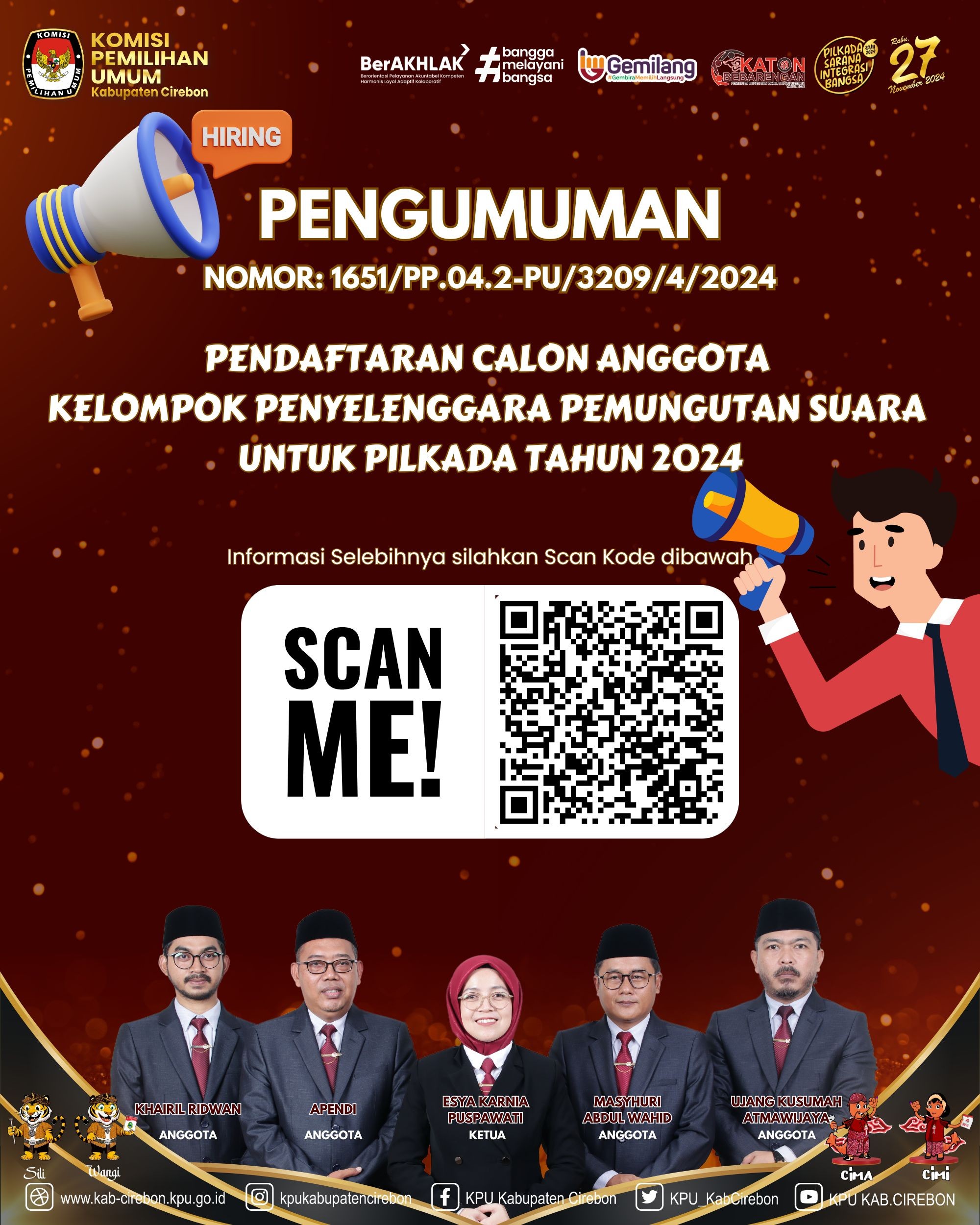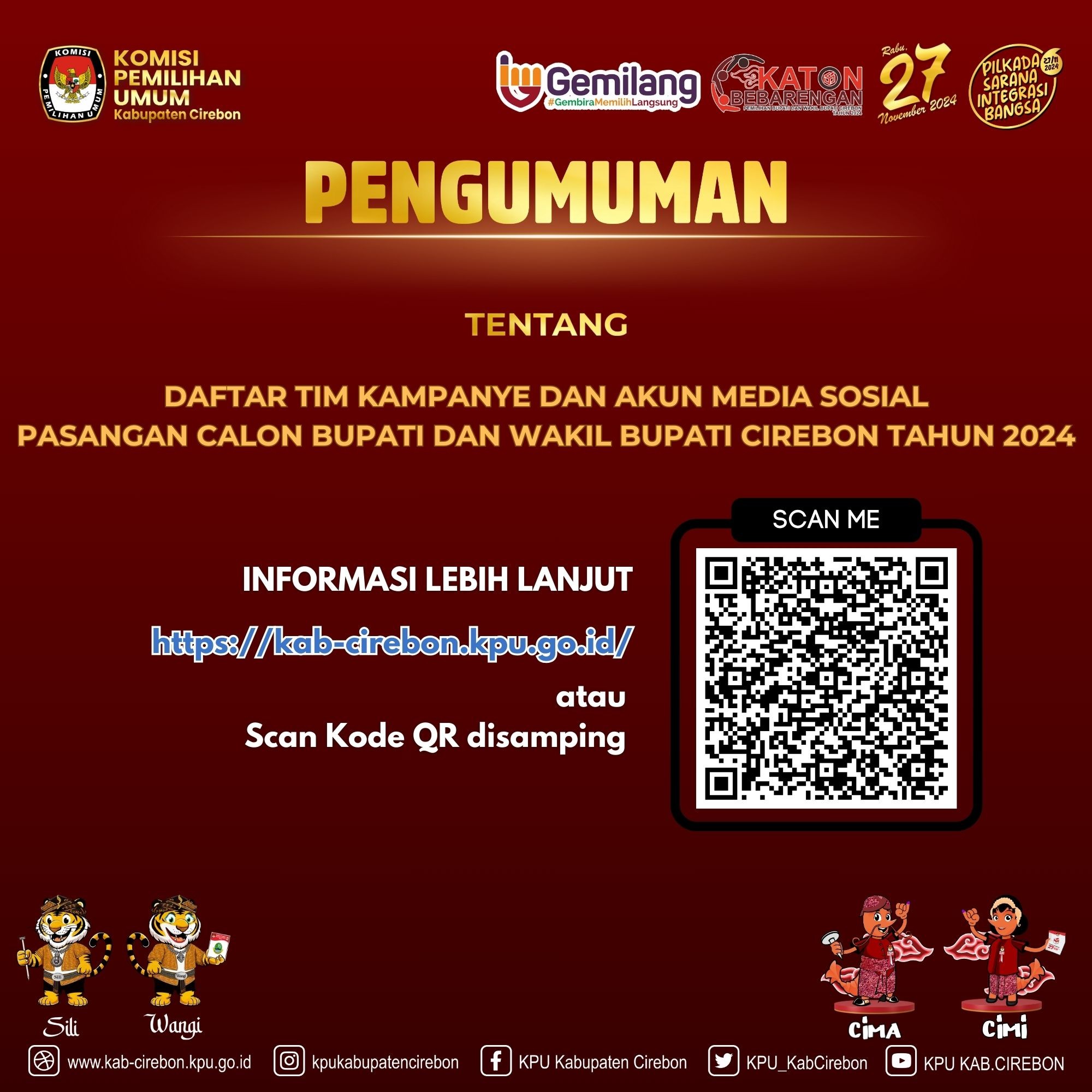 Keputusan Komisi Pemilihan Umum Kabupaten Cirebon Nomor 1867 Tahun 2024 tentang Penetapan Pasangan Calon Peserta Pemilihan Bupati dan Wakil Bupati Cirebon Tahun 2024 dapat diunduh pada tautan jdih.kpu.go.id/jabar/cirebon.