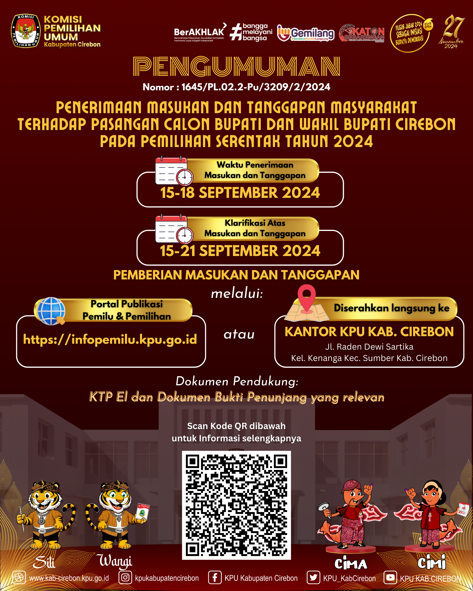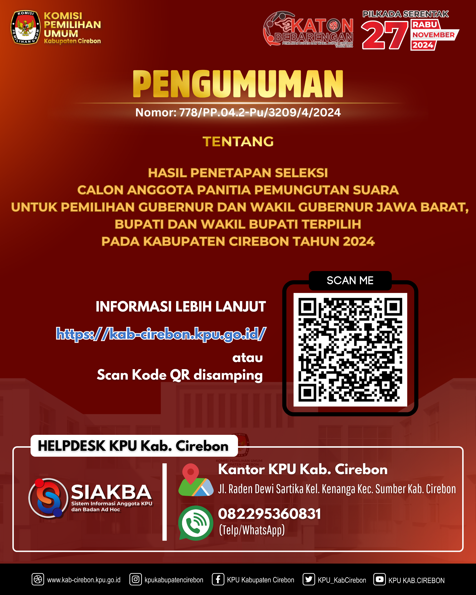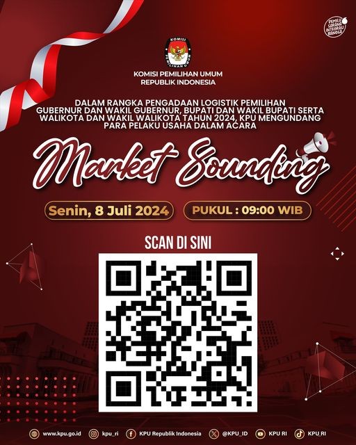 Dalam rangka Pengadaan Logistik Pemilihan Gubernur dan Wakil Gubernur, Bupati dan Wakil Bupati, serta Walikota dan Wakil Walikota Tahun 2024, KPU mengundang para pelaku usaha secara luring dan daring dalam acara Market Sounding yang akan dilaksanakan pada hari Senin, 8 Juli 2024 Pukul 09.00 WIB s.d selesai bertempat di The Ritz-Carlton Jakarta - Jl. Dr. Ida Anak Agung Gde Agung No. 1 Kav.E.1.1, Kuningan Timur, Setiabudi, Jakarta Selatan.