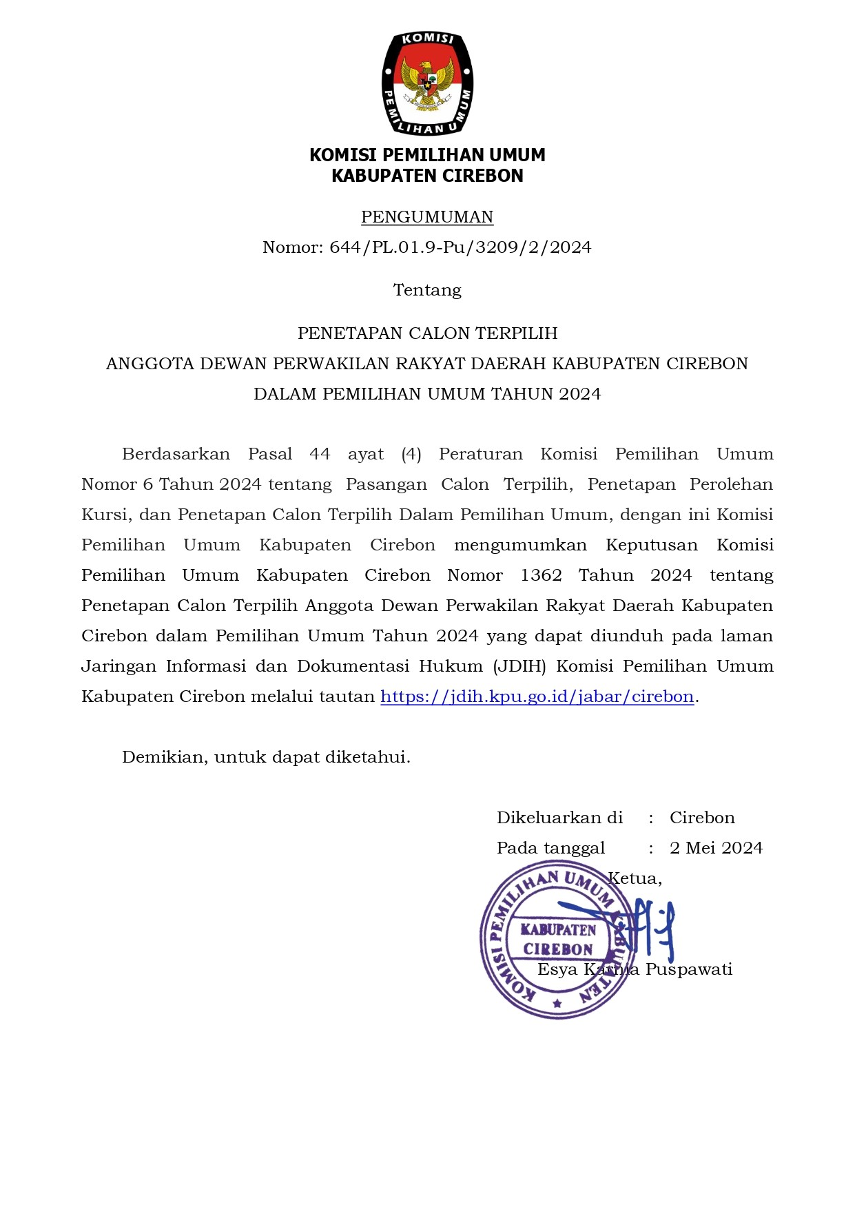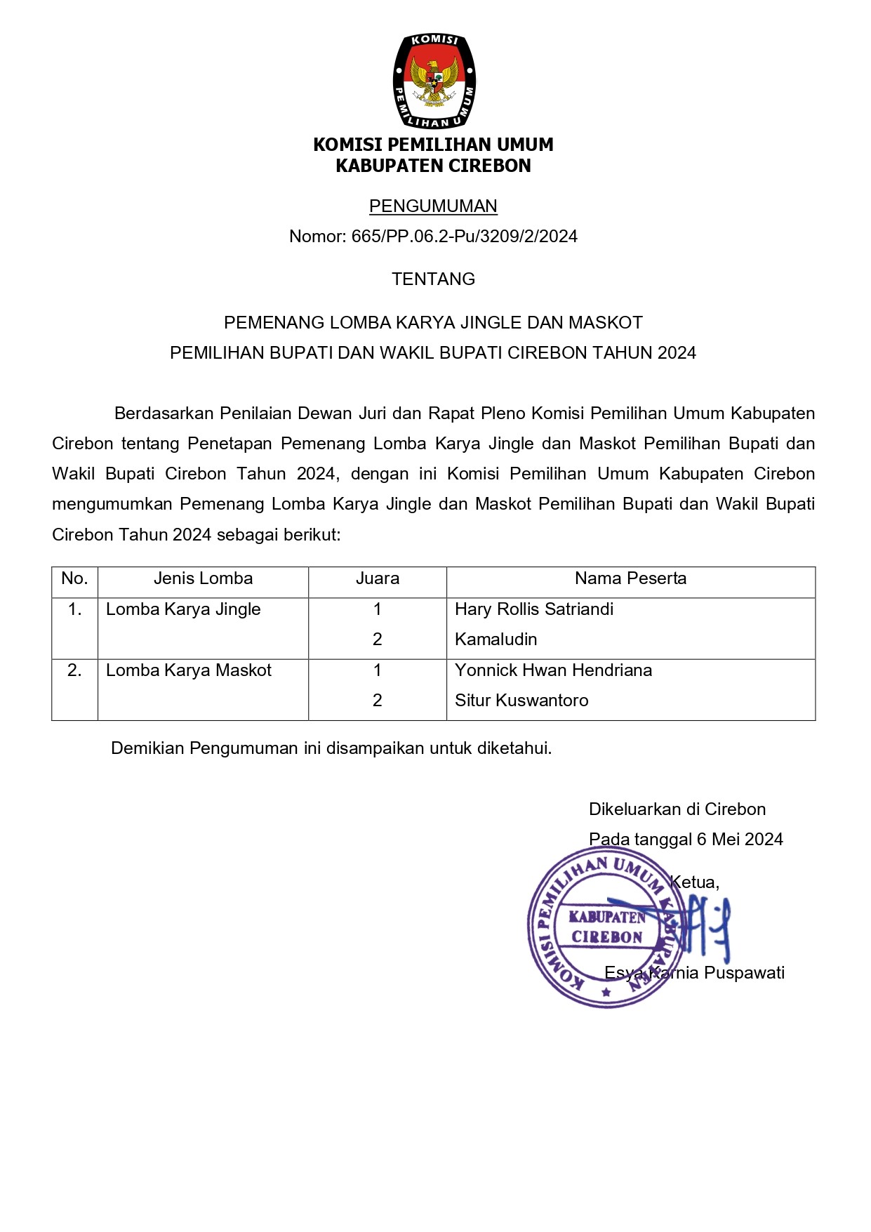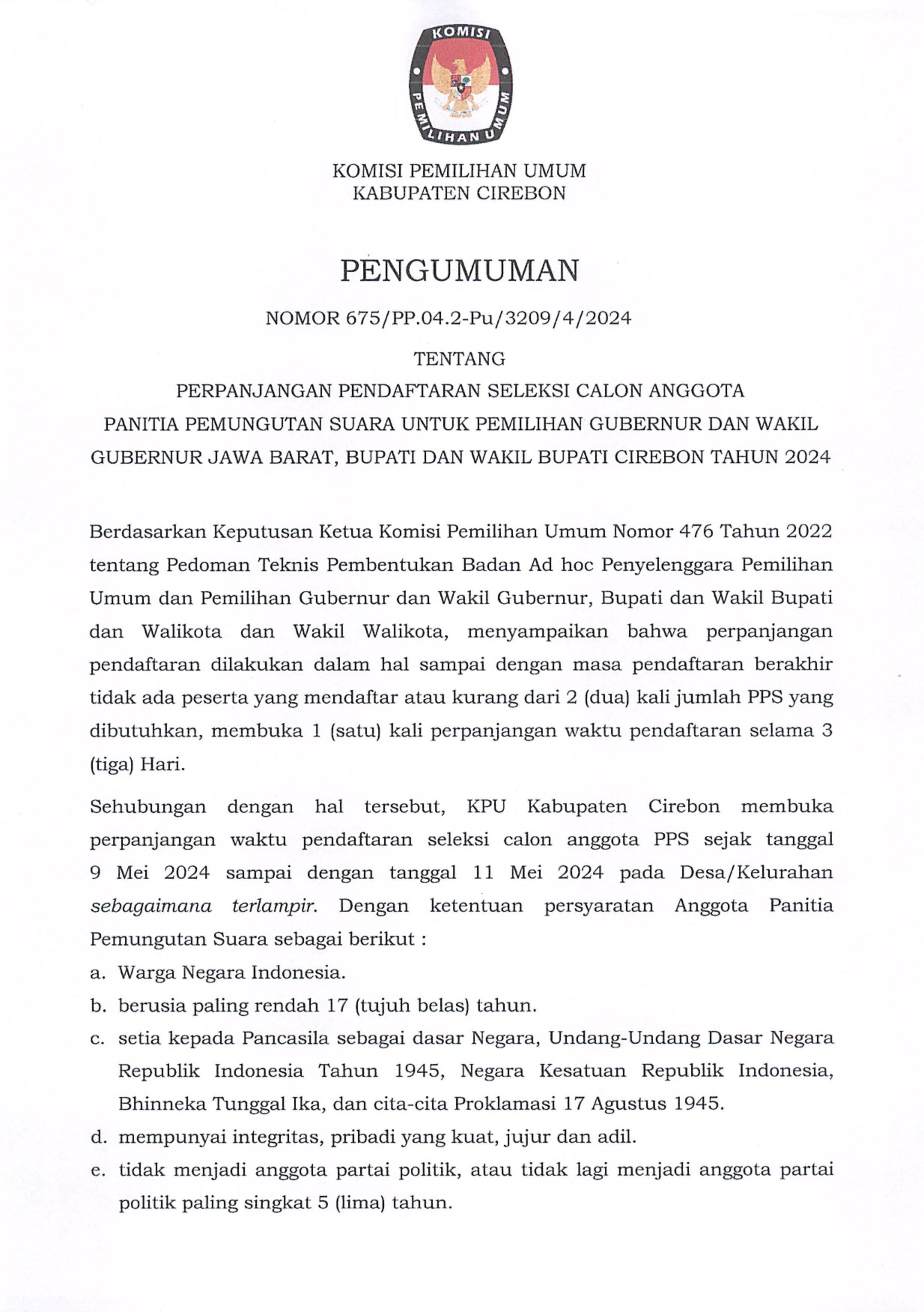 PENGUMUMAN NOMOR 675/PP.04.2-Pu/3209/4/2024 TENTANG PERPANJANGAN PENDAFTARAN SELEKSI CALON ANGGOTA PANITIA PEMUNGUTAN SUARA UNTUK PEMILIHAN GUBERNUR DAN WAKIL GUBERNUR JAWA BARAT, BUPATI DAN WAKIL BUPATI CIREBON TAHUN 2024 Berdasarkan Keputusan Ketua Komisi Pemilihan Umum Nomor 476 Tahun 2022 tentang Pedoman Teknis Pembentukan Badan Ad hoc Penyelenggara Pemilihan Umum dan Pemilihan Gubernur dan Wakil Gubernur, Bupati dan Wakil Bupati dan Walikota dan Wakil Walikota, menyampaikan bahwa perpanjangan pendaftaran dilakukan dalam hal sampai dengan masa pendaftaran berakhir tidak ada peserta yang mendaftar atau kurang dari 2 (dua) kali jumlah PPS yang dibutuhkan, membuka 1 (satu) kali perpanjangan waktu pendaftaran selama 3 (tiga) Hari. Sehubungan dengan hal tersebut, KPU Kabupaten Cirebon membuka perpanjangan waktu pendaftaran seleksi calon anggota PPS sejak tanggal 9 Mei 2024 sampai dengan tanggal 11 Mei 2024 pada Desa/Kelurahan sebagaimana terlampir. Dengan ketentuan persyaratan Anggota Panitia Pemungutan Suara sebagai berikut : Warga Negara Indonesia. berusia paling rendah 17 (tujuh belas) tahun. setia kepada Pancasila sebagai dasar Negara, Undang-Undang Dasar Negara Republik Indonesia Tahun 1945, Negara Kesatuan Republik Indonesia, Bhinneka Tunggal Ika, dan cita-cita Proklamasi 17 Agustus 1945. mempunyai integritas, pribadi yang kuat, jujur dan adil. tidak menjadi anggota partai politik, atau tidak lagi menjadi anggota partai politik paling singkat 5 (lima) tahun. berdomisili dalam wilayah kerja mampu secara jasmani, rohani, dan bebas dari penyalahgunaan narkotika. berpendidikan paling rendah sekolah menengah atas atau sederajat. tidak pernah dipidana penjara berdasarkan putusan pengadilan yang telah memperoleh kekuatan hukum tetap karena melakukan tindak pidana yang diancam dengan pidana penjara 5 (lima) tahun atau lebih. Kelengkapan Dokumen Persyaratan : surat pendaftaran sebagai calon anggota PPS menggunakan format surat pendaftaran sebagai calon anggota PPS. fotokopi kartu tanda penduduk elektronik sejumlah 1 (satu) lembar. fotokopi ijazah sekolah menengah atas/sederajat atau ijazah terakhir. surat pernyataan bermeterai sebagaimana dimaksud untuk persyaratan pada huruf c, huruf d, huruf e, huruf g, dan huruf i merupakan satu dokumen surat pernyataan yang menyatakan : setia kepada Pancasila sebagai dasar Negara, Undang-Undang Dasar Negara Republik Indonesia Tahun 1945, Negara Kesatuan Republik Indonesia, Bhinneka Tungga Ika, dan cita-cita Proklamasi 17 Agustus 1945; tidak menjadi anggota Partai Politik; bebas dari penyalahgunaan narkotika; mempunyai integritas, pribadi yang kuat, jujur dan adil; tidak pernah dipidana penjara berdasarkan putusan pengadilan yang telah memperoleh kekuatan hukum tetap karena melakukan tindak pidana yang diancam dengan pidana penjara 5 (lima) tahun atau lebih; tidak pernah dijatuhi sanksi pemberhentian tetap oleh KPU Kabupaten/Kota atau Dewan Kehormatan Penyelenggara Pemilu; tidak menjadi tim kampanye atau tim pemenangan atau saksi peserta pemilu atau Pemilihan pada penyelenggaraan Pemilu dan Pemilihan paling singkat dalam 5 (lima) tahun terakhir; tidak ada berada dalam ikatan perkawinan dengan sesama penyelenggara Pemilu; tidak memiliki penyakit penyerta (komorbiditas); mempunyai kemampuan dan kecakapan dalam membaca, menulis dan berhitung; mampu mengoperasikan perangkat teknologi informasi; dan sehat rohani. surat keterangan sehat jasmani terbaru dikeluarkan oleh rumah sakit, puskesmas, atau klinik yang termasuk di dalamnya terdapat hasil pemeriksaan tekanan darah, kadar gula darah, dan kolesterol. daftar riwayat hidup menggunakan formulir menggunakan format daftar riwayat hidup. pas foto berwarna 4x6 sebanyak 1 (satu) lembar. surat keterangan Partai Politik mengacu pada ketentuan masing-masing Partai Politik bagi calon PPS yang tidak lagi menjadi anggota Partai Politik paling singkat 5 (lima) tahun. surat pernyataan bermeterai yang memuat informasi bahwa nama dan identitas calon PPS digunakan oleh Partai Politik tanpa sepengetahuan yang bersangkutan bagi calon PPS yang nama dan identitasnya digunakan oleh Partai Politik tanpa sepengetahuan yang bersangkutan.**) *) hanya bagi calon PPS yang pernah menjadi anggota partai politik. **) hanya bagi calon PPS yang namanya terdaftar sebagai anggota partai politik tanpa sepengatahuan yang bersangkutan. Informasi tentang Pengumuman dan Lampiran bisa diunduh DISINI
