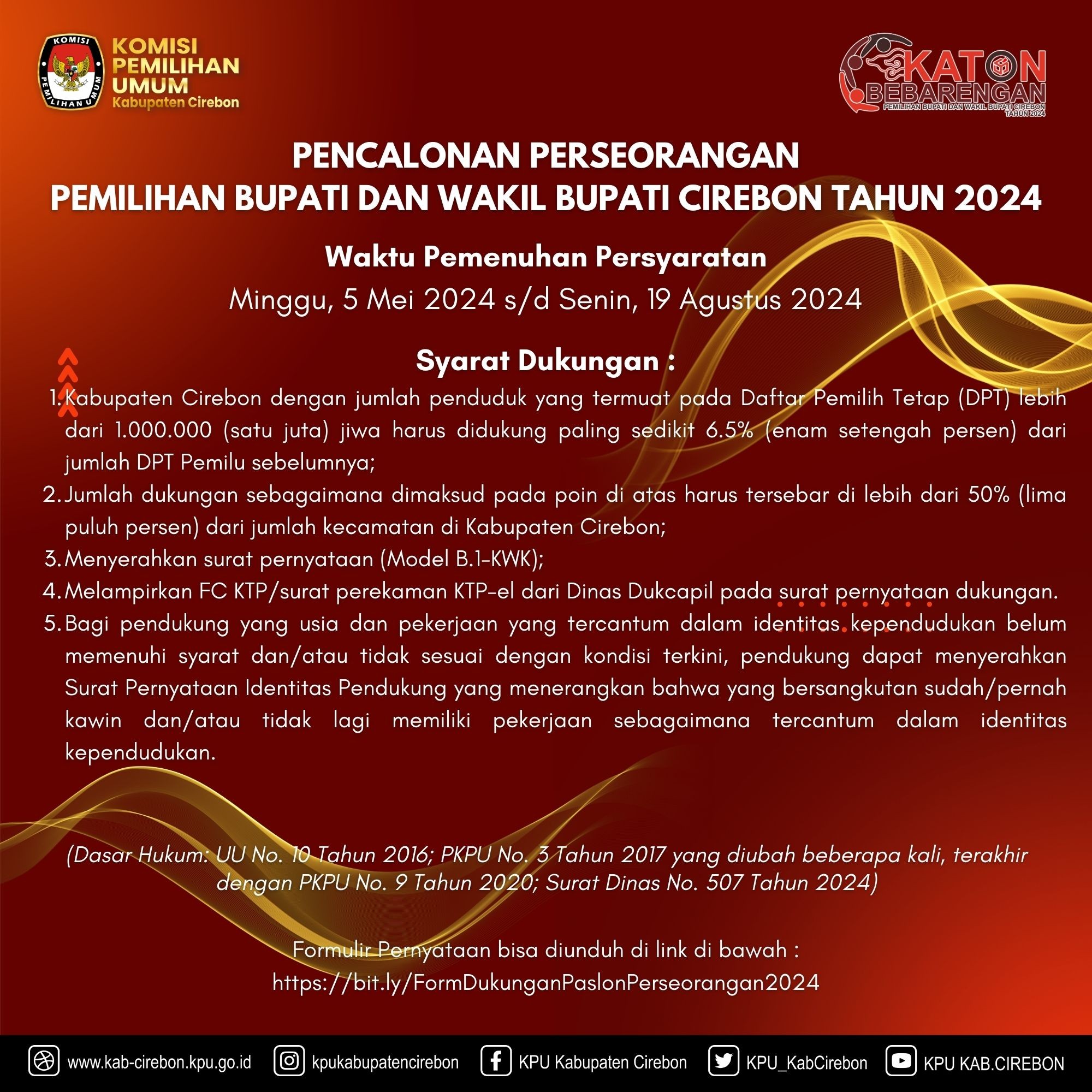 Bagi bakal pasangan calon perseorangan Bupati dan Wakil Bupati Cirebon yang berstatus sebagai anggota KPU, KPU Provinsi, KPU Kabupaten/Kota, Bawaslu, Bawaslu Provinsi, Bawaslu Kabupaten/Kota, berhenti sebelum pembentukan PPK dan PPS